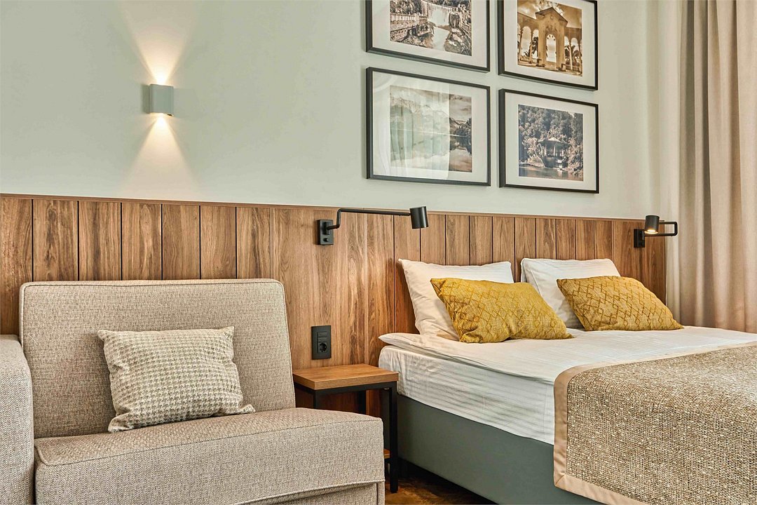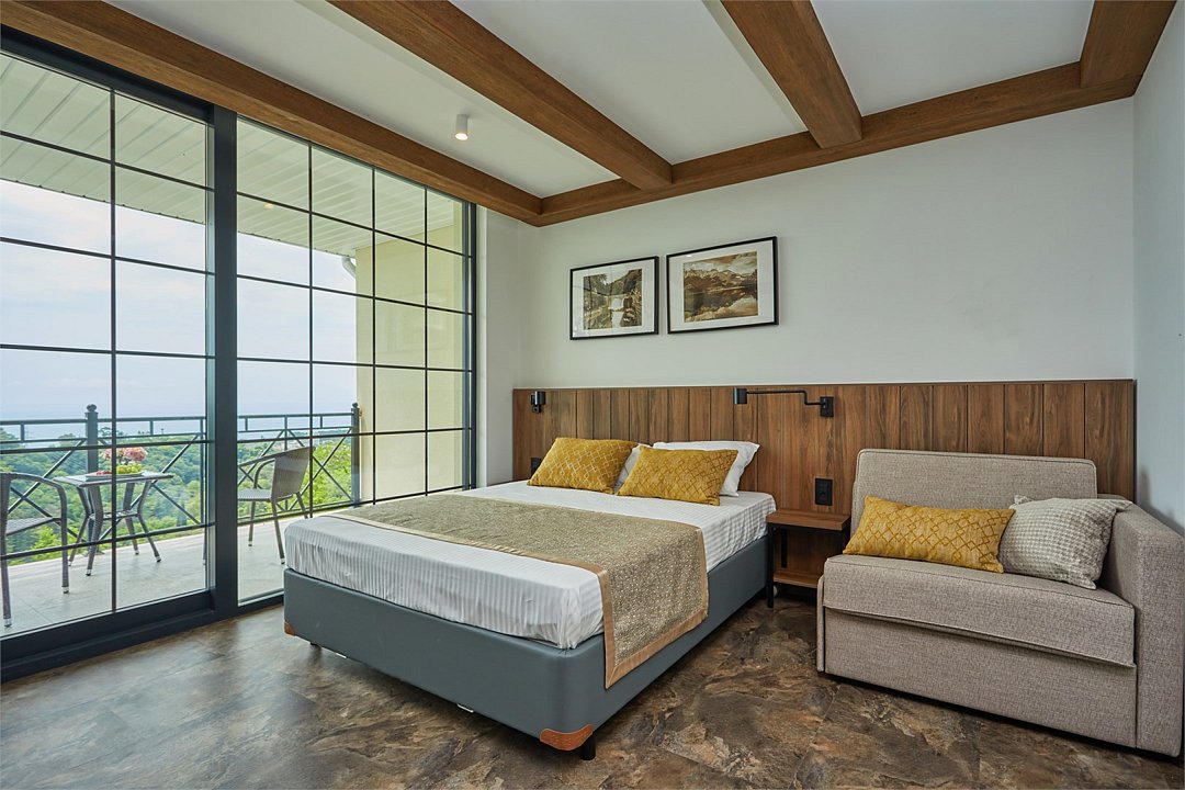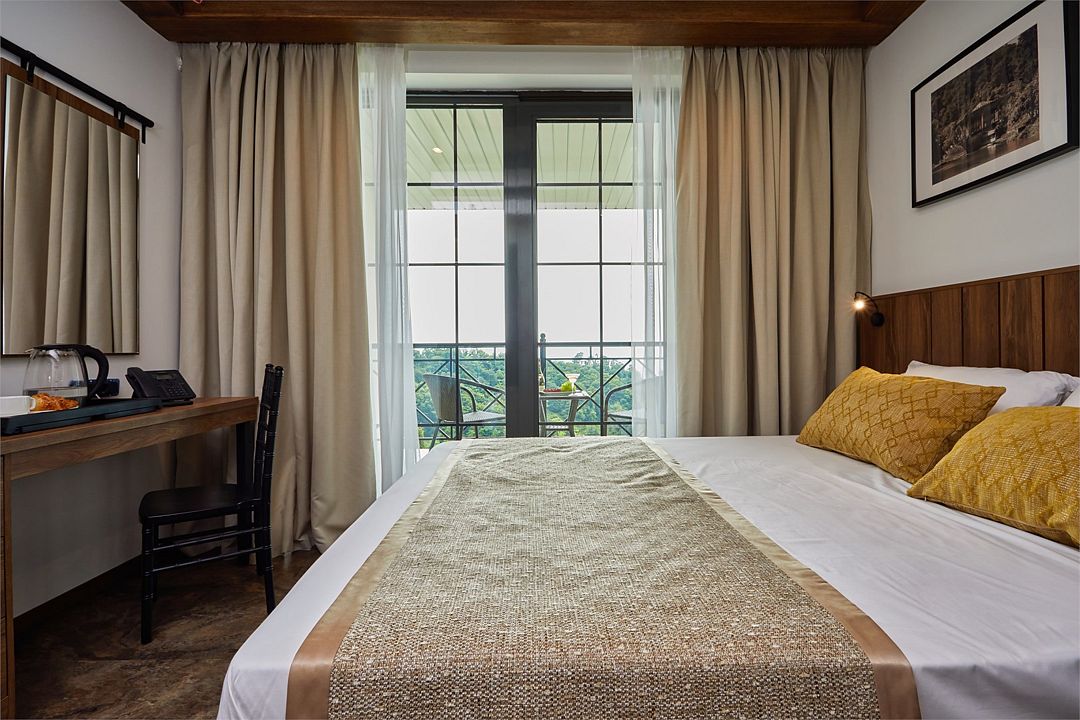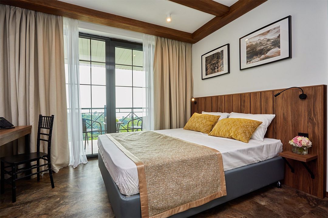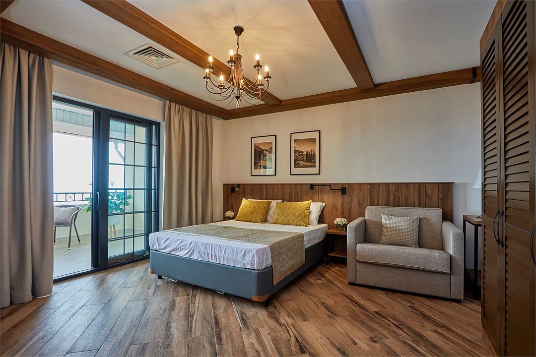 Уютный и комфортный однокомнатный номер с 2-спальной кроватью, креслом-кроватью и балконом с видом на море. Идеальное решение для семьи с ребенком. В стоимость включен прекрасный завтрак от шеф-повара.Услуги и удобства