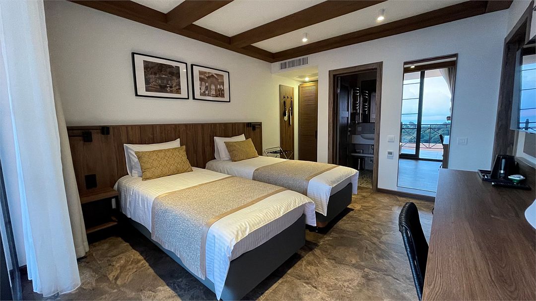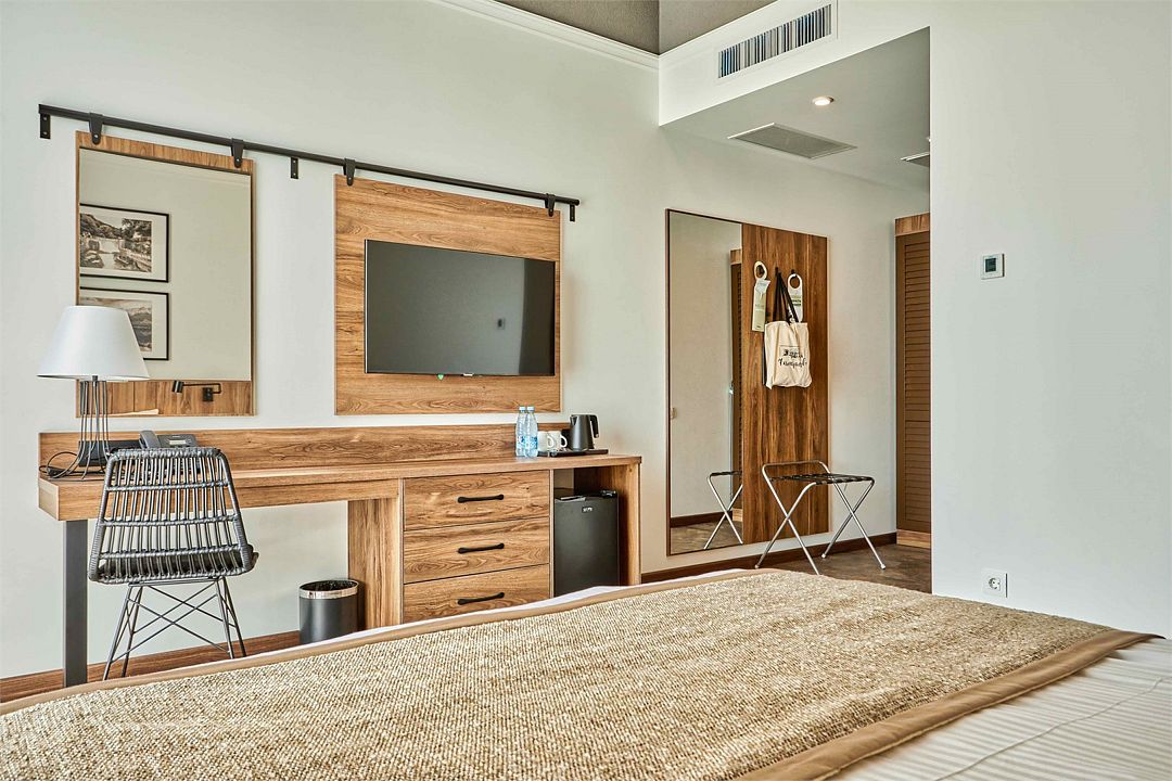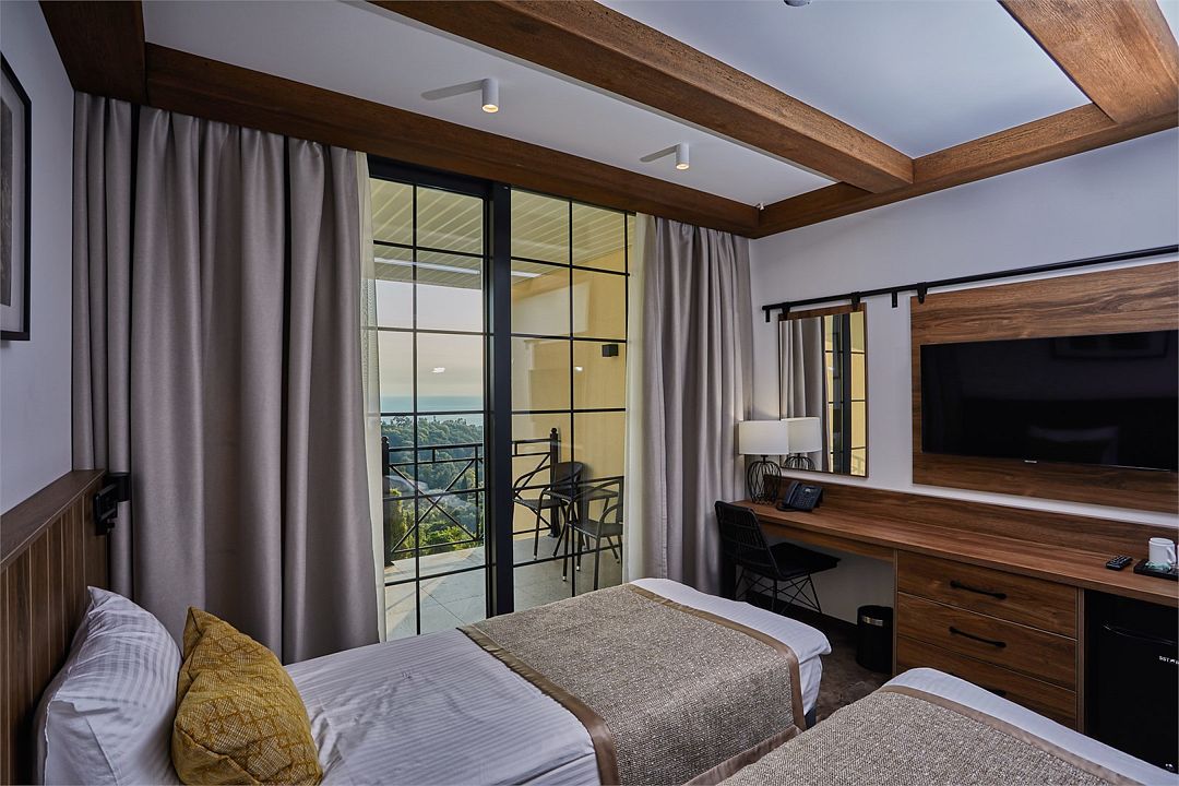 Wi-Fi, система климат-контроля, душевая кабина, халаты, банные полотенца, пляжные полотенца, тапочки, балкон, кровать «Queen size», две односпальные кровати, шкаф для одежды, вешалки, звуконепроницаемые стены и окна, чайный набор, сейф, питьевая вода, отдельный вход в номер, вид на море, стол, туалетные средства, сушилка для белья, внутренний телефон, телевизор с плоским экраном, мини-холодильник, общественный бассейн, чайная станция, можно с питомцамиВ гостиничном номере