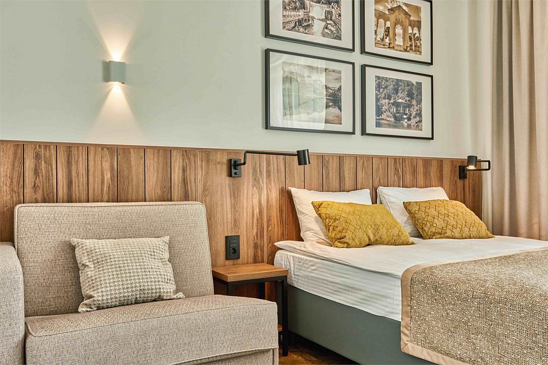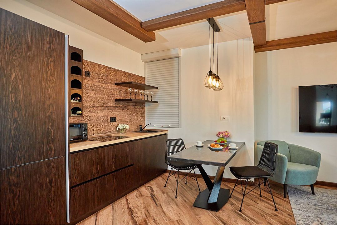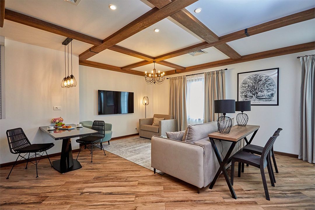 Просторные и комфортные апартаменты подходят для размещения семьи. В них есть всё для комфортного проживания: прихожая, гостиная с кухней и спальня. В апартаментах есть возможность разместить до 4-х дополнительных мест. В стоимость включен прекрасный завтрак от шеф-повара.Услуги и удобства
