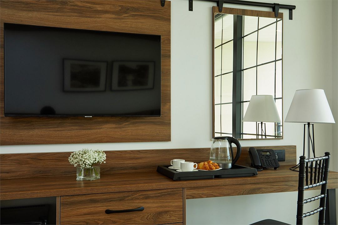 Wi-Fi, система климат-контроля, фен, электронные замки, душевая кабина, теплый пол, халаты, банные полотенца, пляжные полотенца, тапочки, косметические средства, балкон, кровать «Queen size», шкаф для одежды, вешалки, багажная тумба, сейф, питьевая вода, вид на море, сушилка для белья, раскладное кресло, внутренний телефон, телевизор с плоским экраном, мини-холодильник, номер для некурящих, общественный бассейн, чайная станция, можно с питомцамиВ гостиничном номере