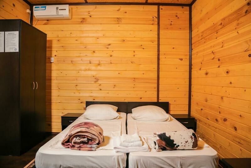 Двухэтажный деревянный корпус гостевого дома разместился на закрытой благоустроенной территории. Гостей ожидают комфортабельные номера с удобствами и отдельным входом. Все комнаты оснащены кондиционерами, которые спасут от жаркого абхазского климата, также в номерах есть телевизор и небольшой холодильник.