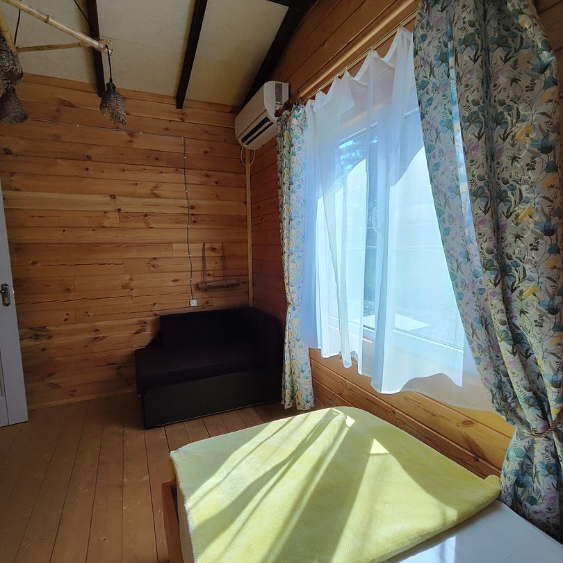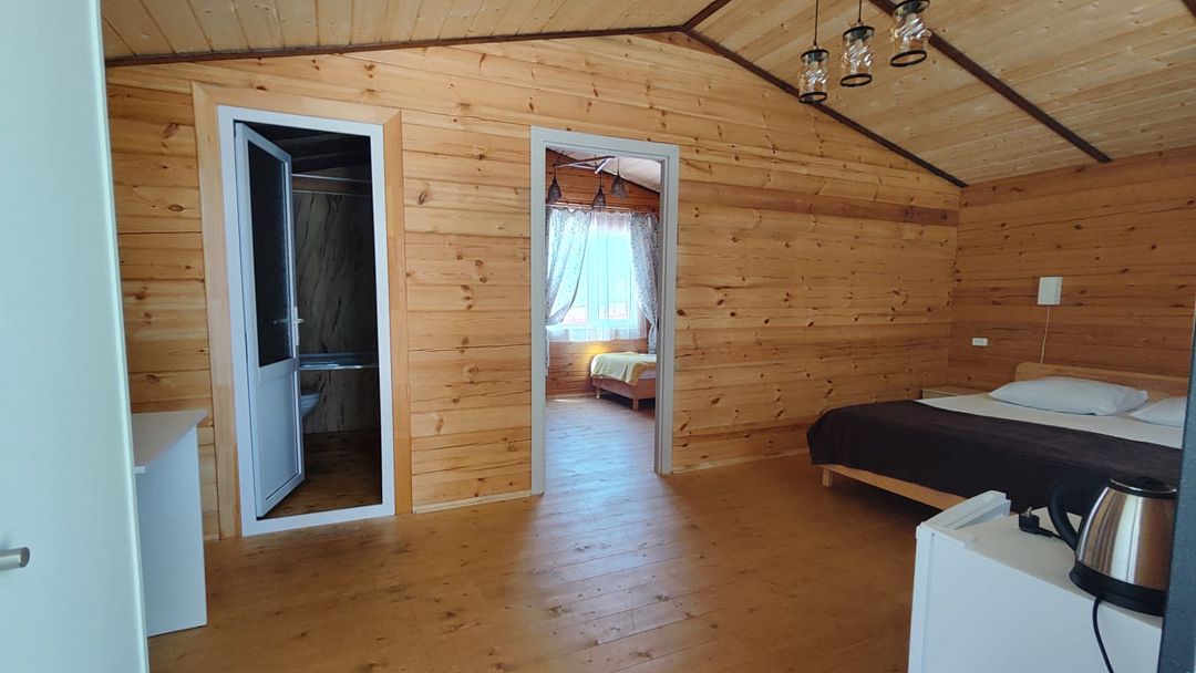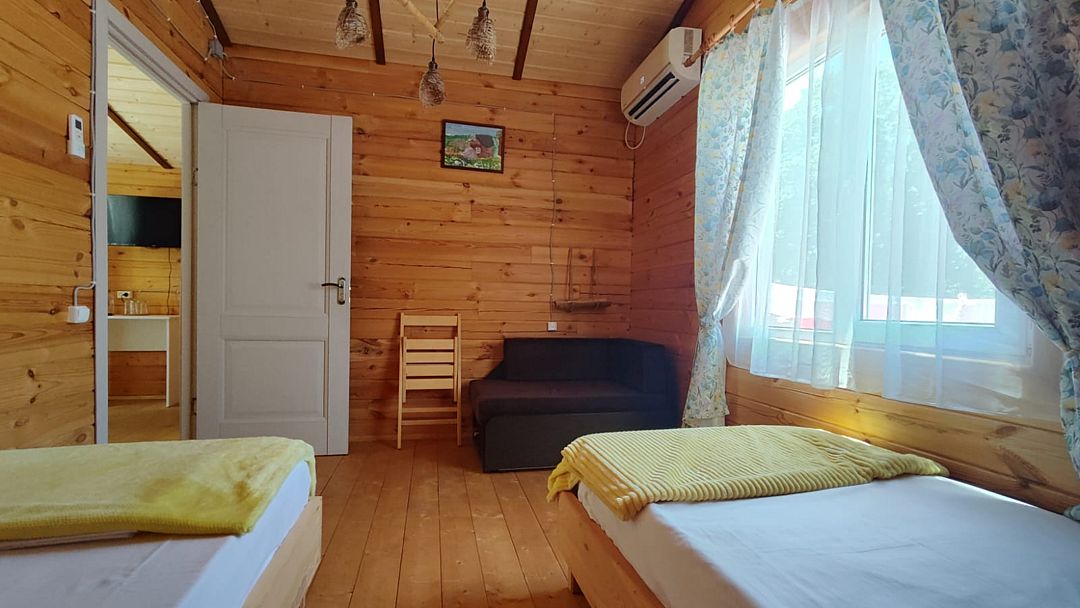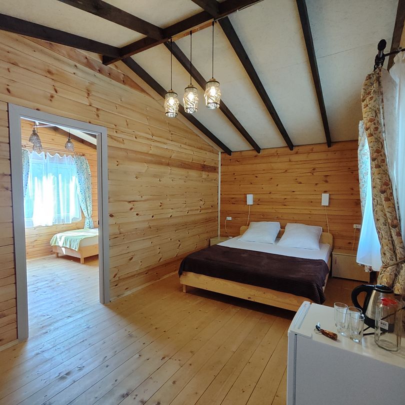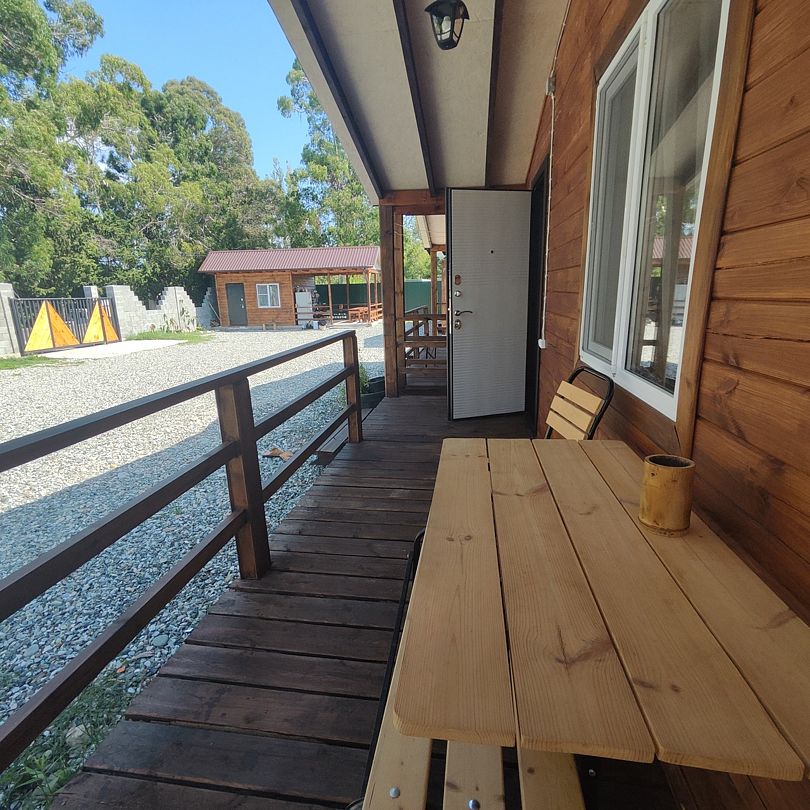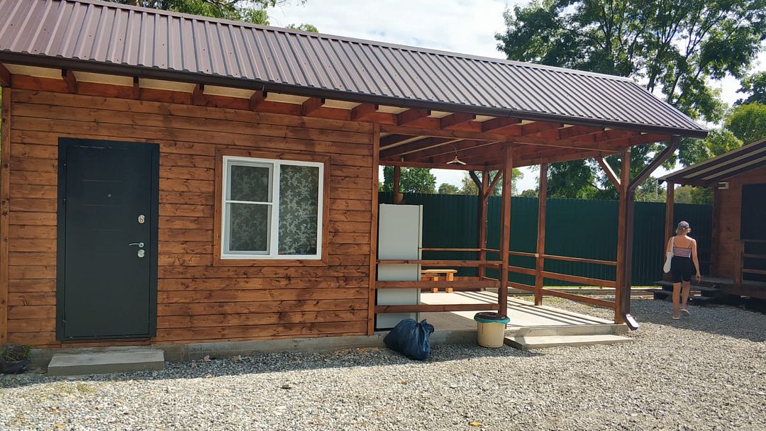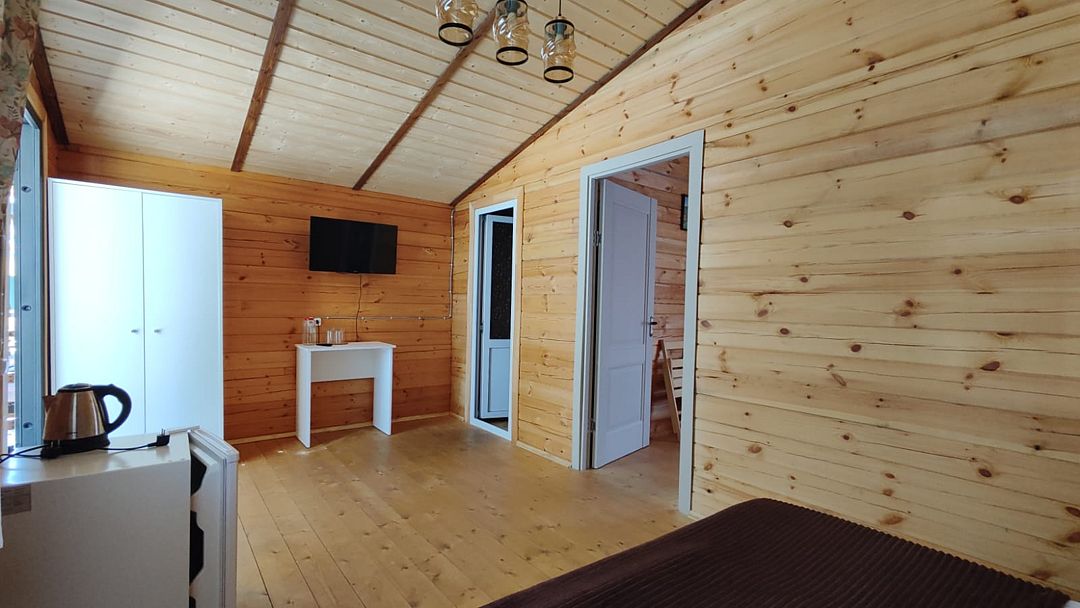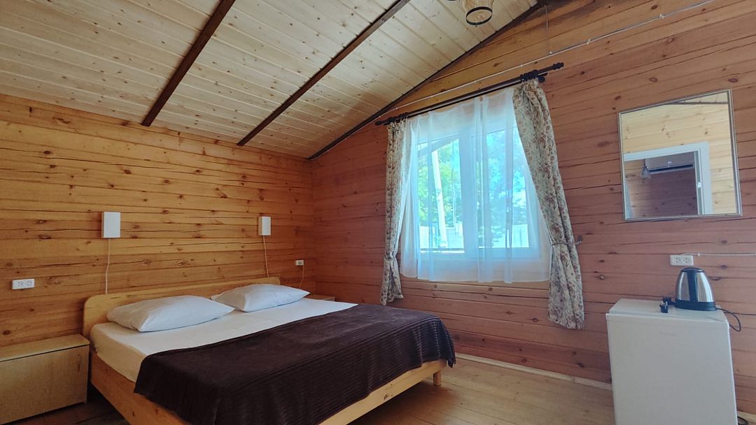 Индивидуальные двухкомнатные, просторные домики со всеми удобствами выполнены из деревянного бруса. Домики вмещают до 6 человек. Все они оснащены санузлом, ТВ, кондиционером, холодильником, Wi-Fi, чайником, феном. У каждого домика есть терраса с садовой мебелью. Вас порадует красивейший вид на горы, аромат эвкалипта в воздухе и близость к ласковому, чистому морю, до которого всего 250 м.