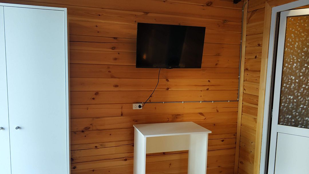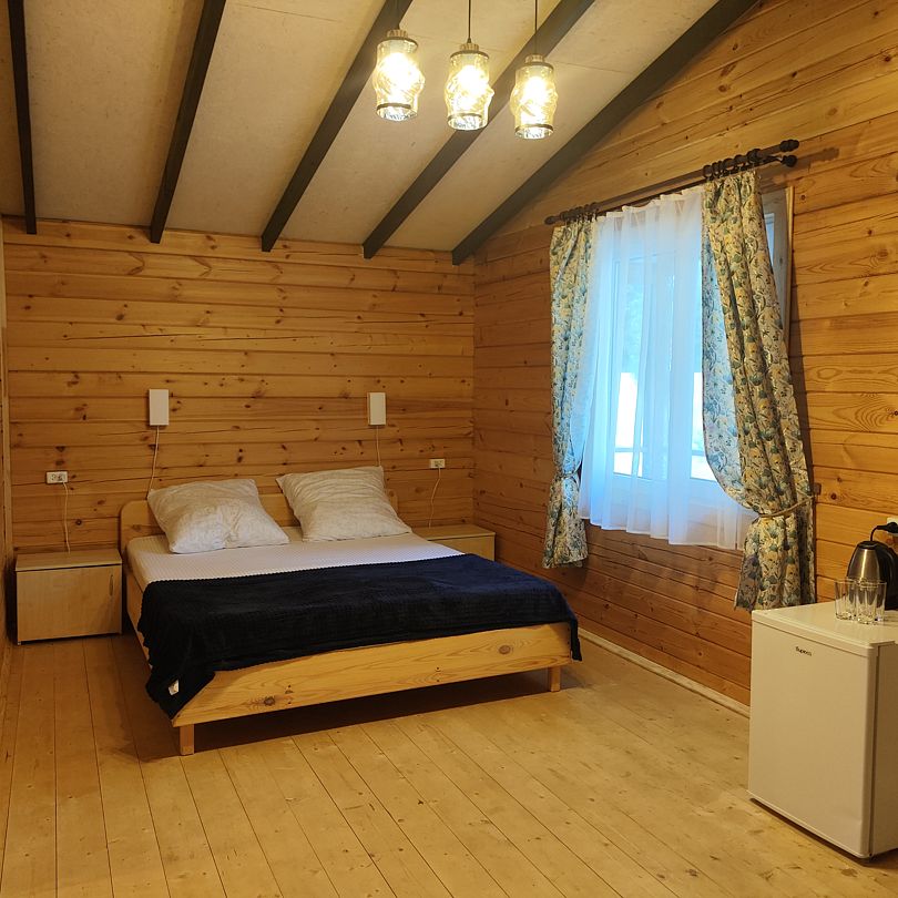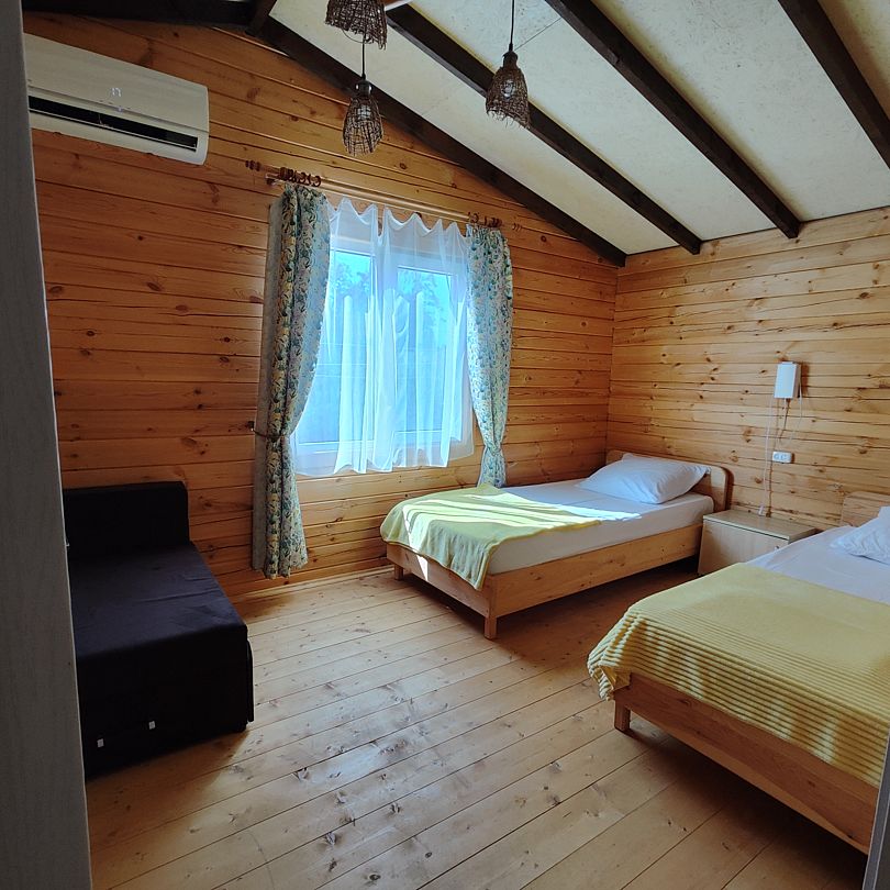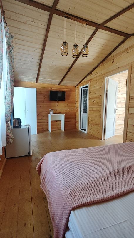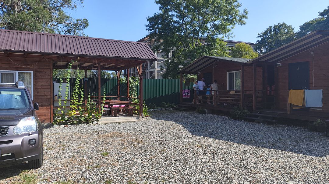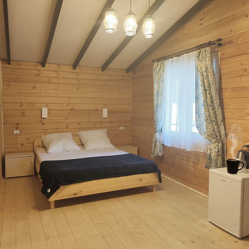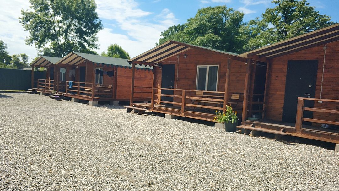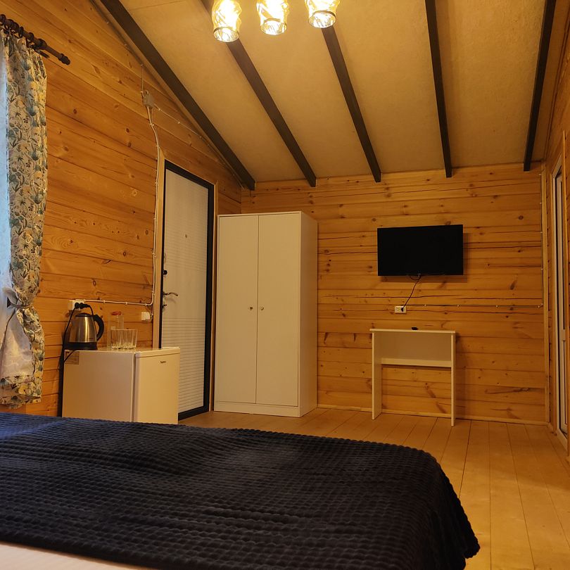 Индивидуальные двухкомнатные, просторные домики со всеми удобствами выполнены из деревянного бруса. Домики вмещают до 6 человек. Все они оснащены санузлом, ТВ, кондиционером, холодильником, Wi-Fi, чайником, феном. У каждого домика есть терраса с садовой мебелью. Вас порадует красивейший вид на горы, аромат эвкалипта в воздухе и близость к ласковому, чистому морю, до которого всего 250 м.