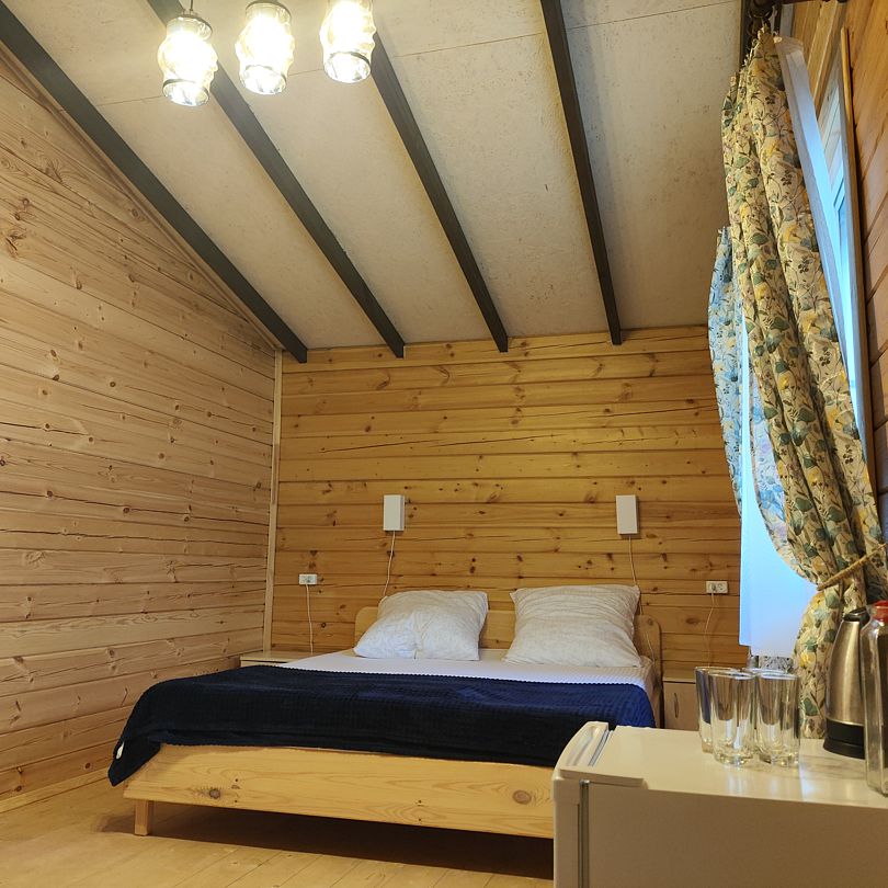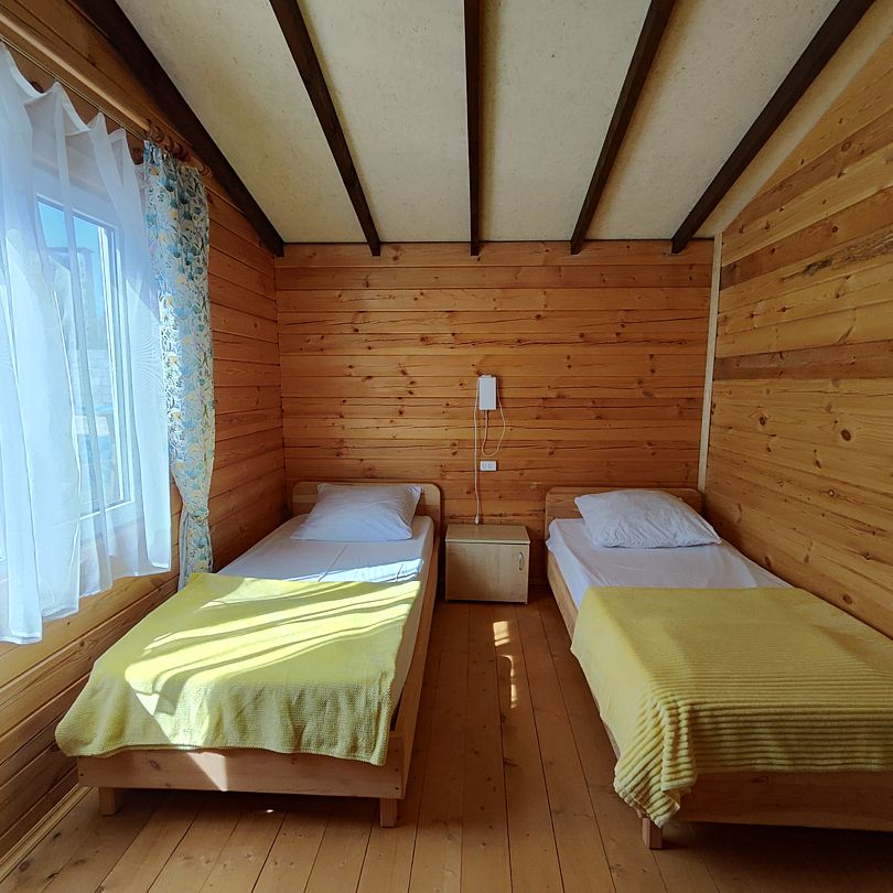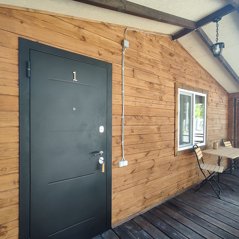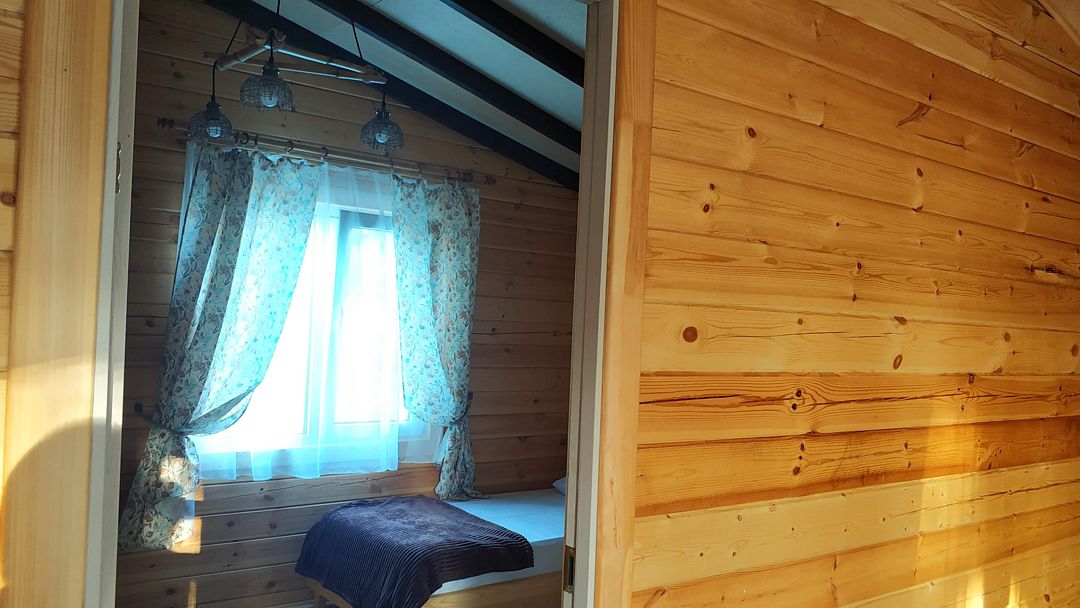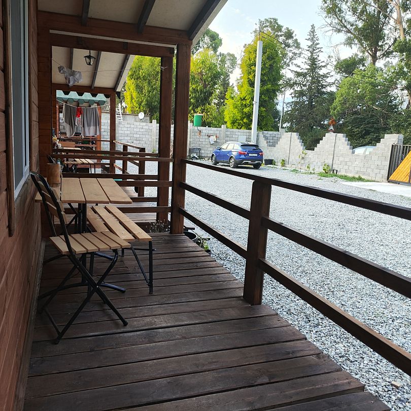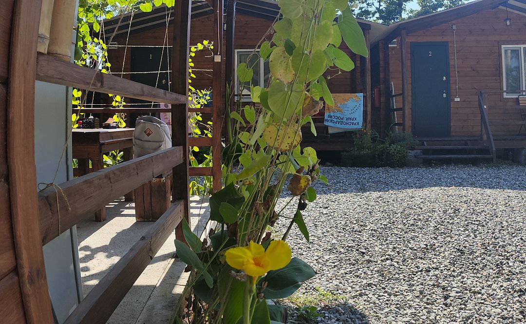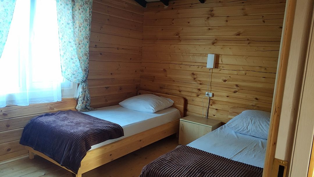 Индивидуальные двухкомнатные, просторные домики со всеми удобствами выполнены из деревянного бруса. Домики вмещают до 6 человек. Все они оснащены санузлом, ТВ, кондиционером, холодильником, Wi-Fi, чайником, феном. У каждого домика есть терраса с садовой мебелью. Вас порадует красивейший вид на горы, аромат эвкалипта в воздухе и близость к ласковому, чистому морю, до которого всего 250 м.