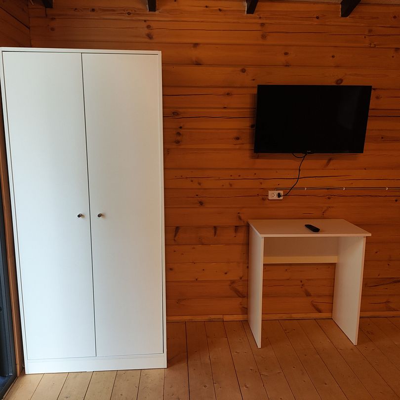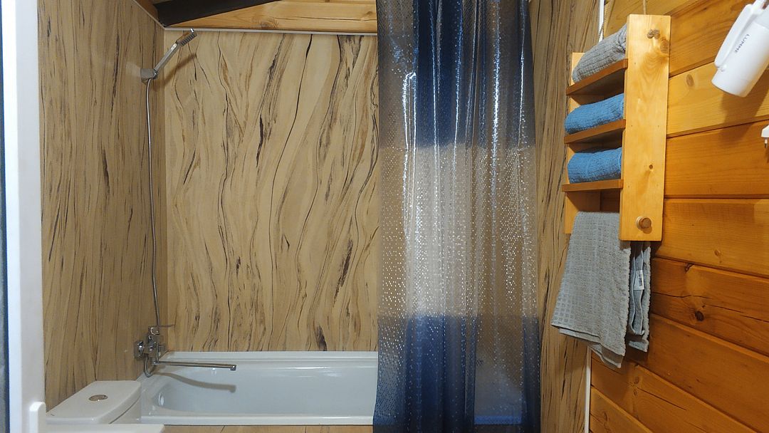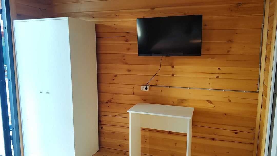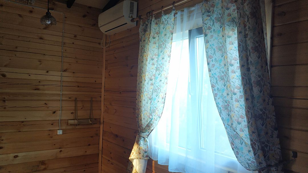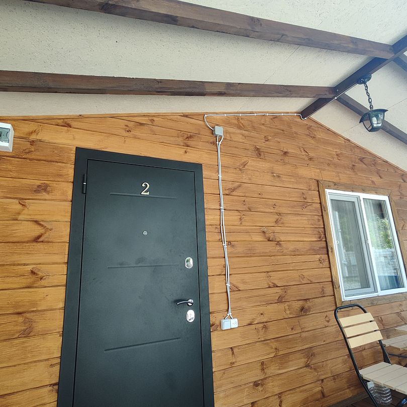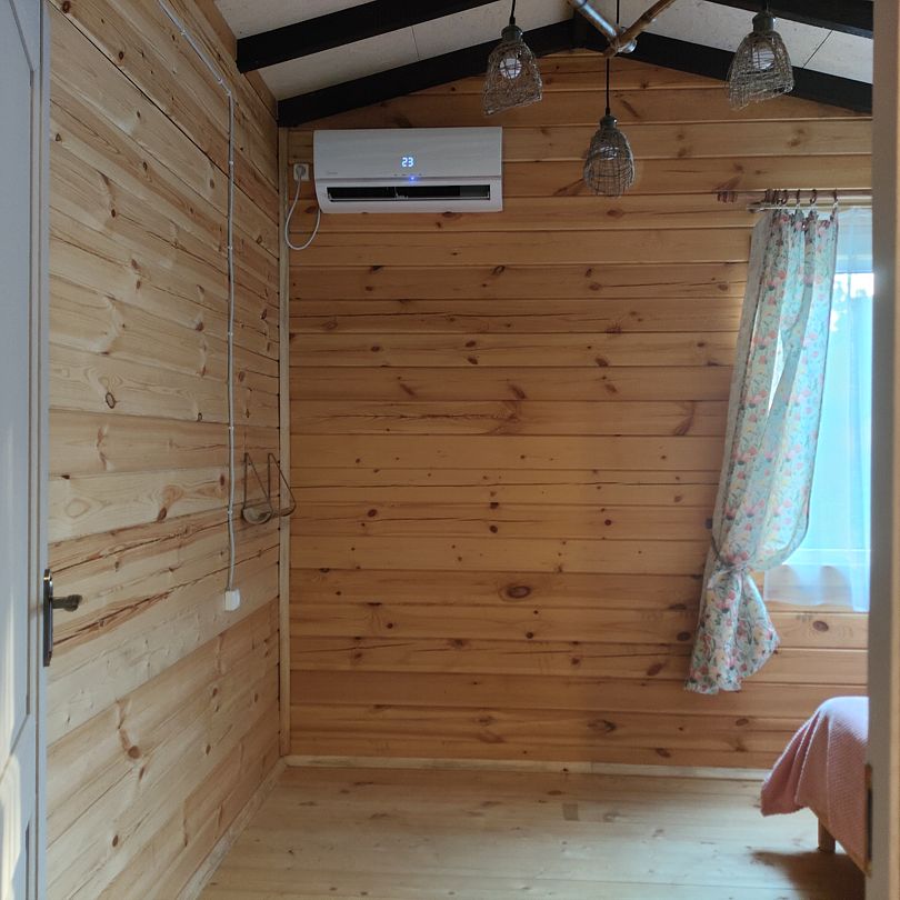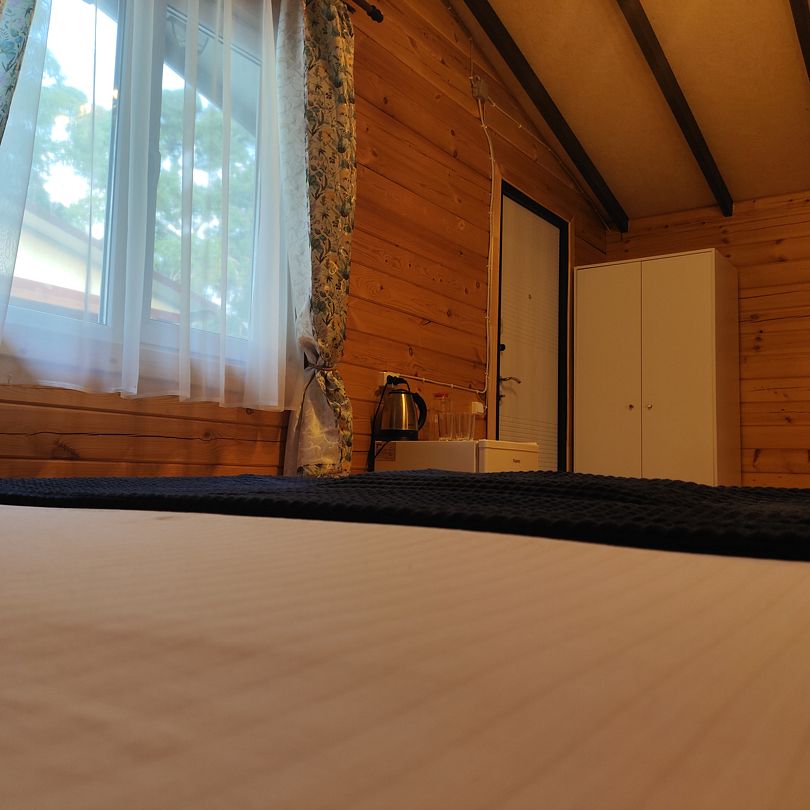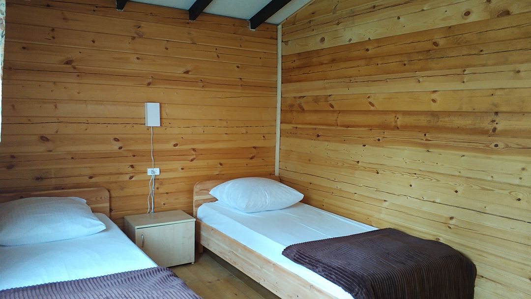 Индивидуальные двухкомнатные, просторные домики со всеми удобствами выполнены из деревянного бруса. Домики вмещают до 6 человек. Все они оснащены санузлом, ТВ, кондиционером, холодильником, Wi-Fi, чайником, феном. У каждого домика есть терраса с садовой мебелью. Вас порадует красивейший вид на горы, аромат эвкалипта в воздухе и близость к ласковому, чистому морю, до которого всего 250 м.