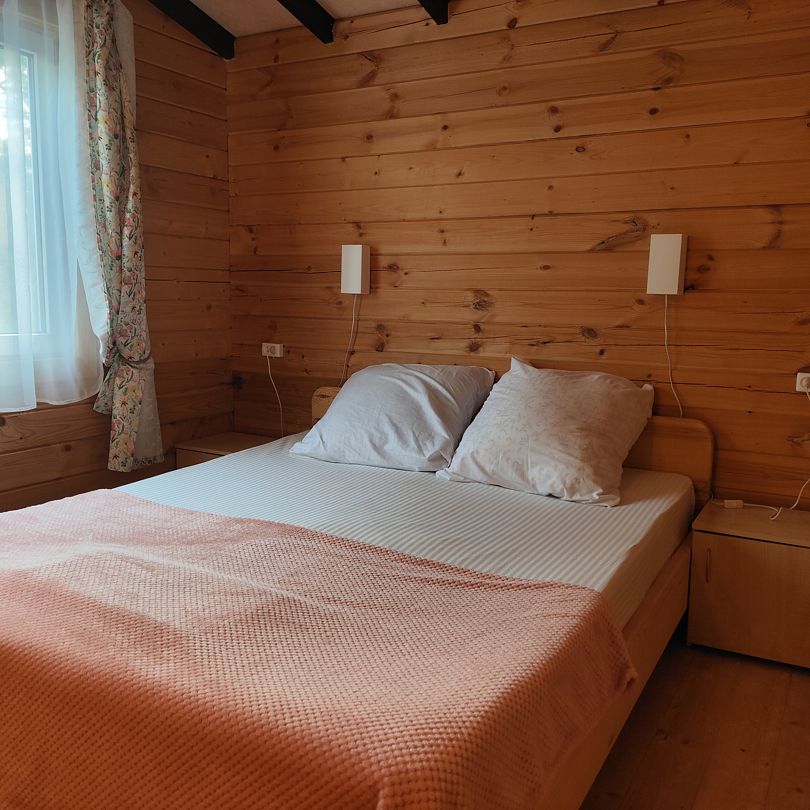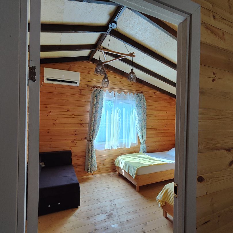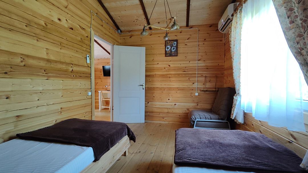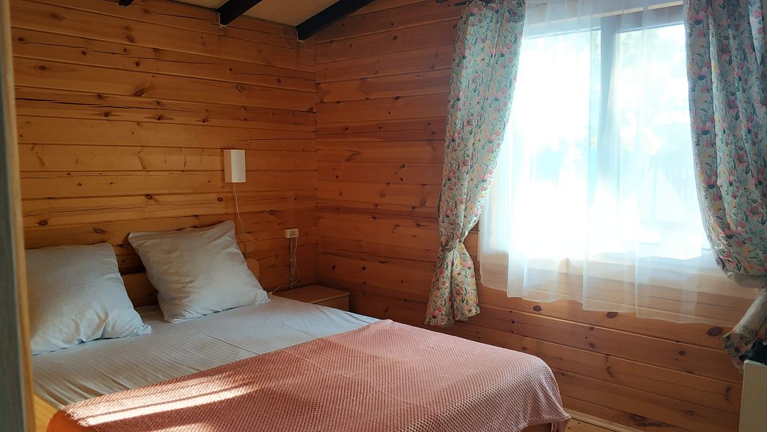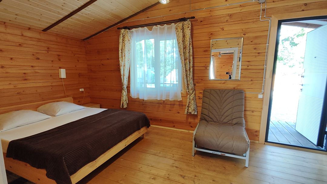 Домик двухкомнатный, с двумя двуспальными кроватями и раскладным креслом, возможно дополнительное место. Вмещает 5-6 человек.