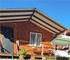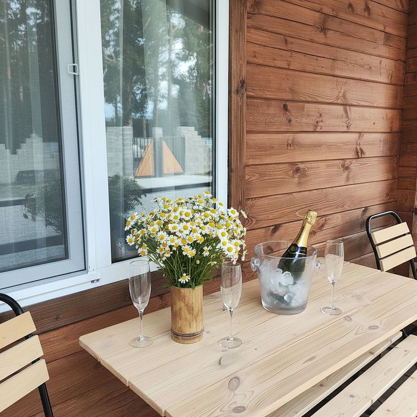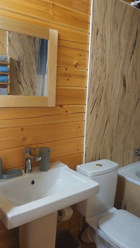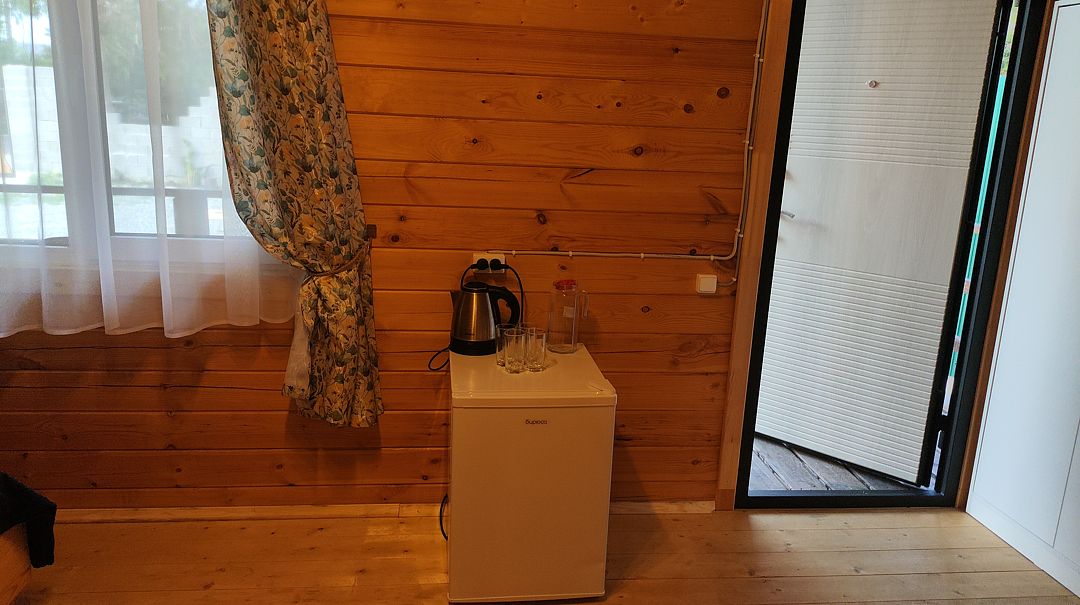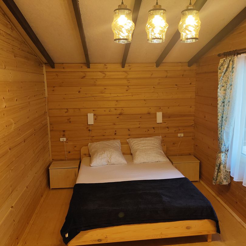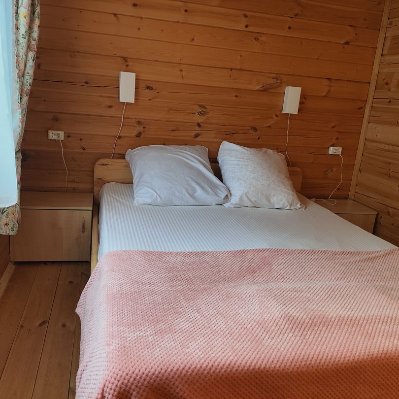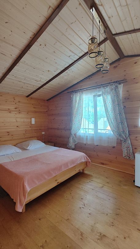 Домик двухкомнатный, с двумя двуспальными кроватями и раскладным креслом, возможно дополнительное место. Вмещает 5-6 человек.