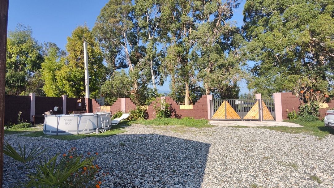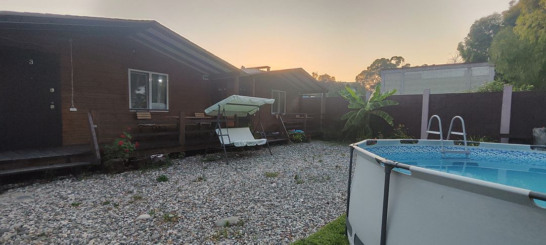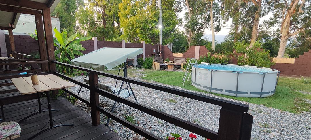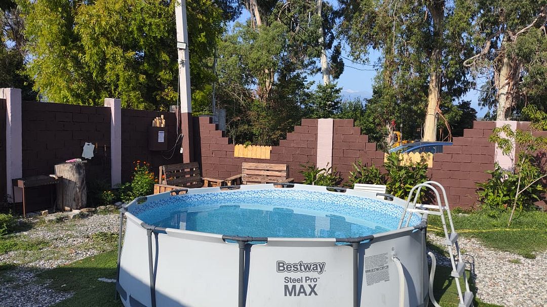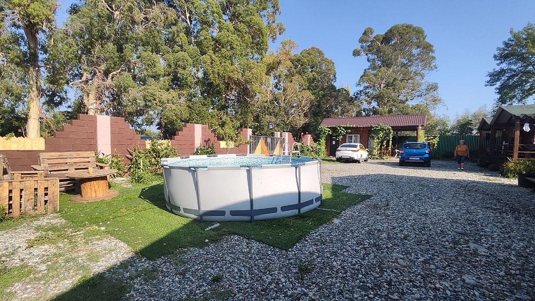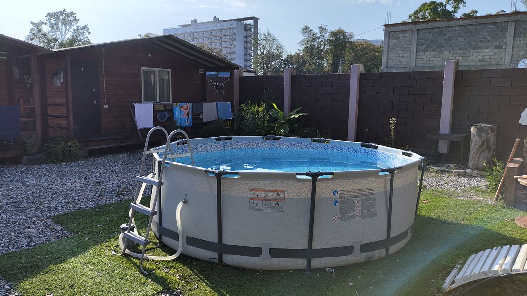 Тип бассейна: открытый бассейн, каркасный бассейнРядом с бассейном: шезлонгиГлубина: 100 смПериод работы: летний сезонНа территории установлен каркасный бассейн.