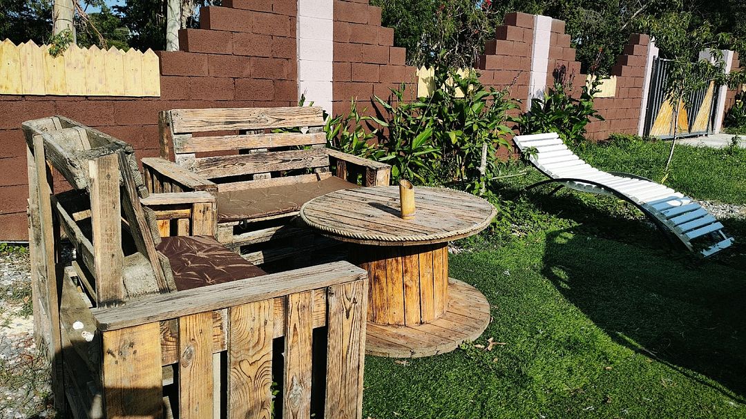 На балконе садовая мебель для отдыха и приема пищи.