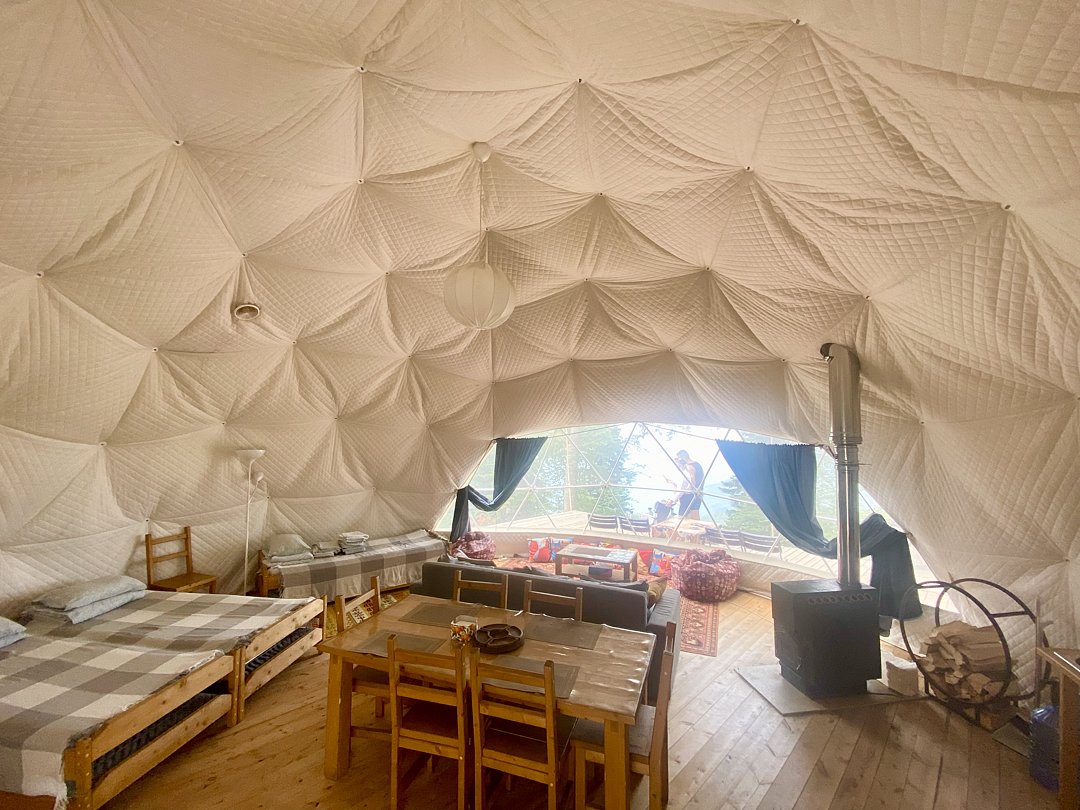 Глэмпинг состоит из домов-сфер, рассчитанных до 6 человек. В сфере есть спальная и кухонная зона, печь на дровах и невероятный панорамный вид на горы, море и облака.