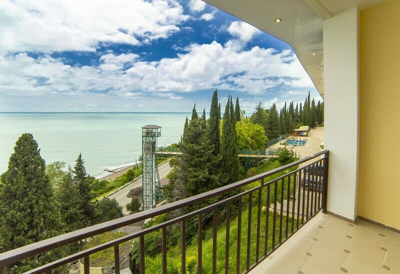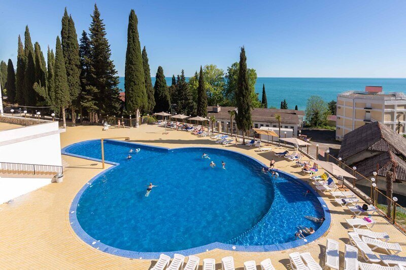 Территория пансионата «Багрипш» в Гагре с кипарисами, олеандрами и пальмами – прекрасное место для пеших прогулок. Здесь есть парковка и аптека, подогреваемый пресноводный бассейн под открытым небом и игровая площадка для детей.