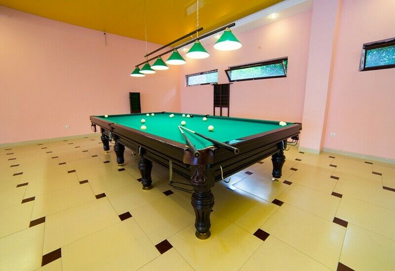Для любителей поиграть в бильярд в пансионате есть оборудованная комната, в которой установлены бильярдные столы, над которыми на цепях подвешены специальные светильники.