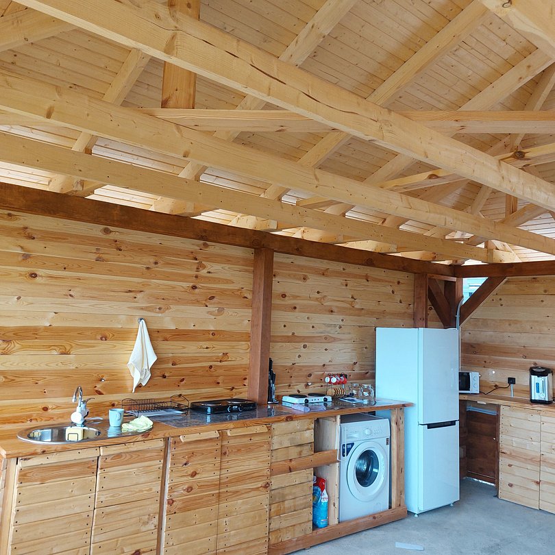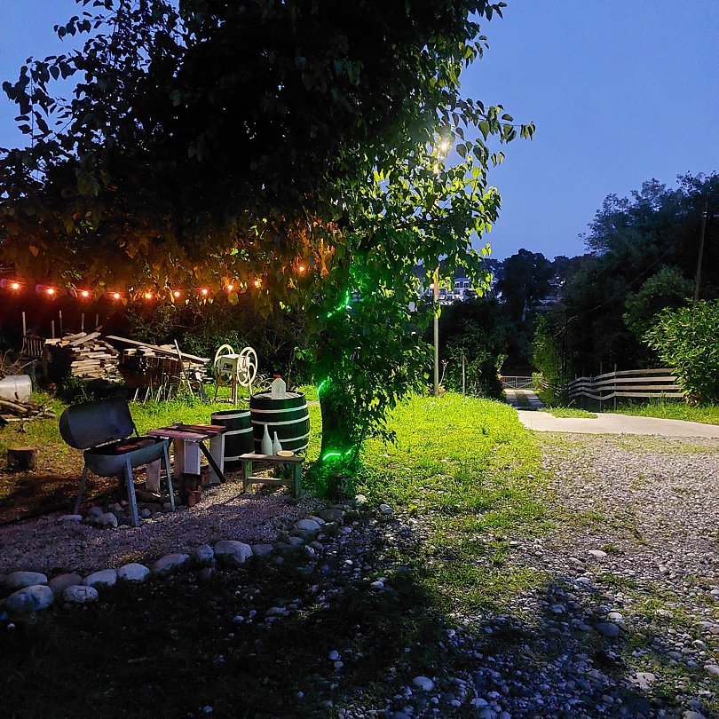 На территории базы отдыха «Ахьаца» имеется беседка, где гости могут комфортно отдохнуть и приготовить блюда на общей кухне. После приготовления пищи можно удобно расположиться за столом со стульями, чтобы насладиться трапезой.