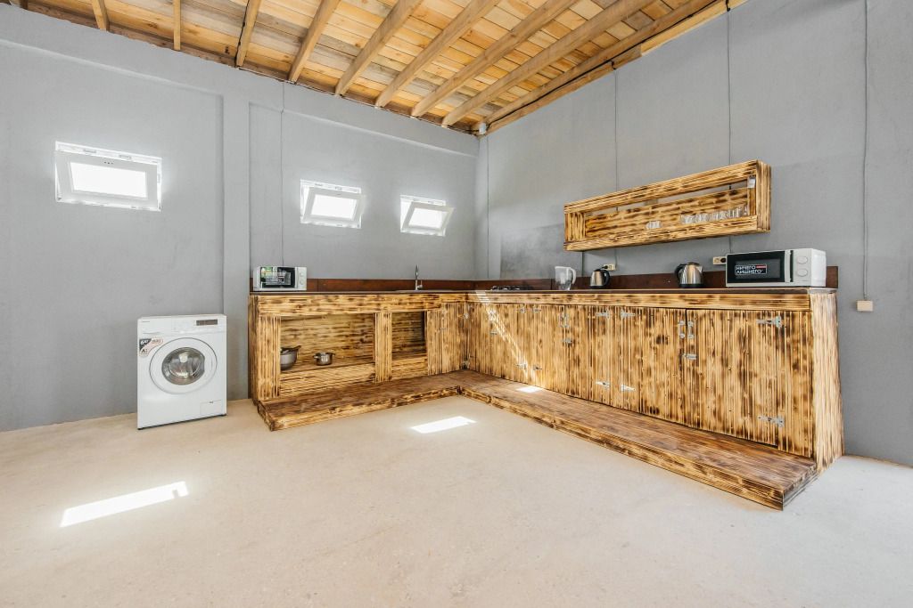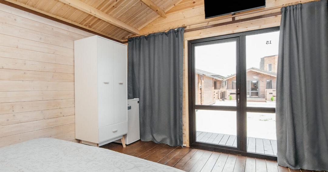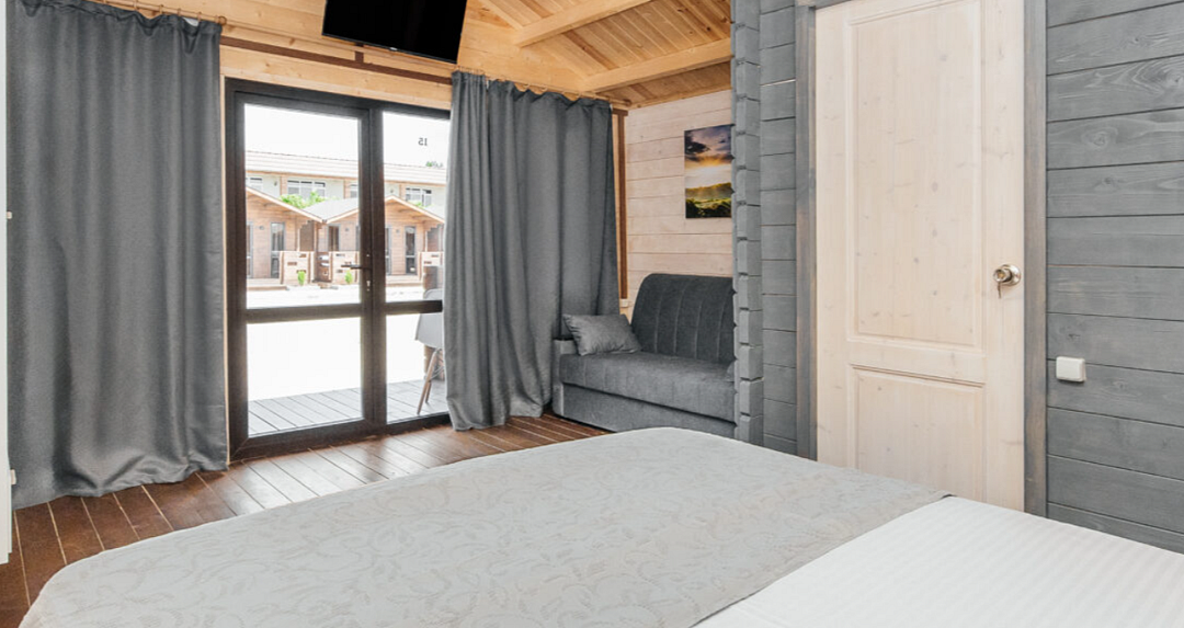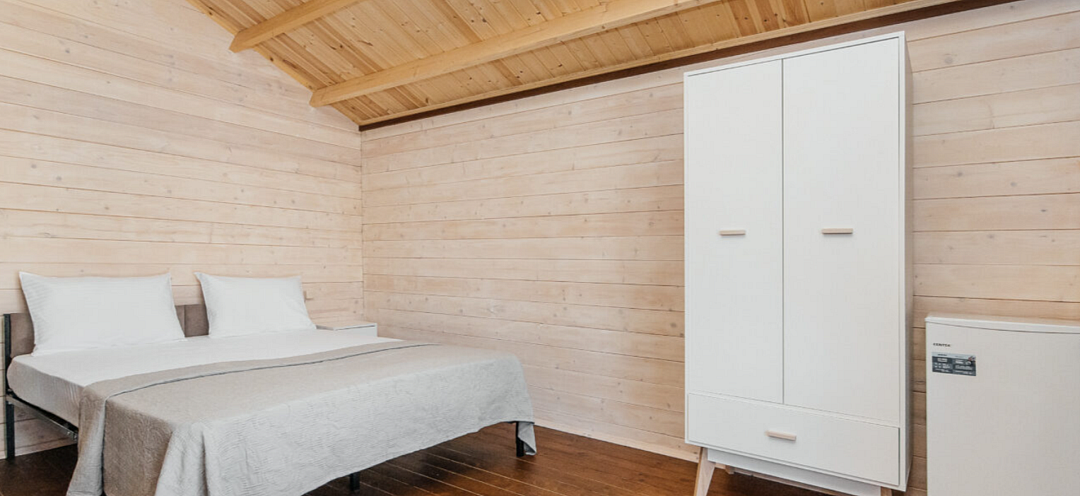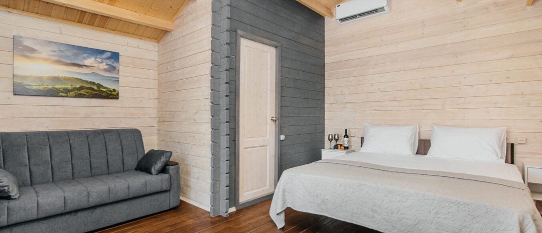 Просторный домик для размещения 2-4 человек. Двуспальная кровать + диван. Из техники есть кондиционер, телевизор и холодильник. В ванной комнате есть всё необходимое.