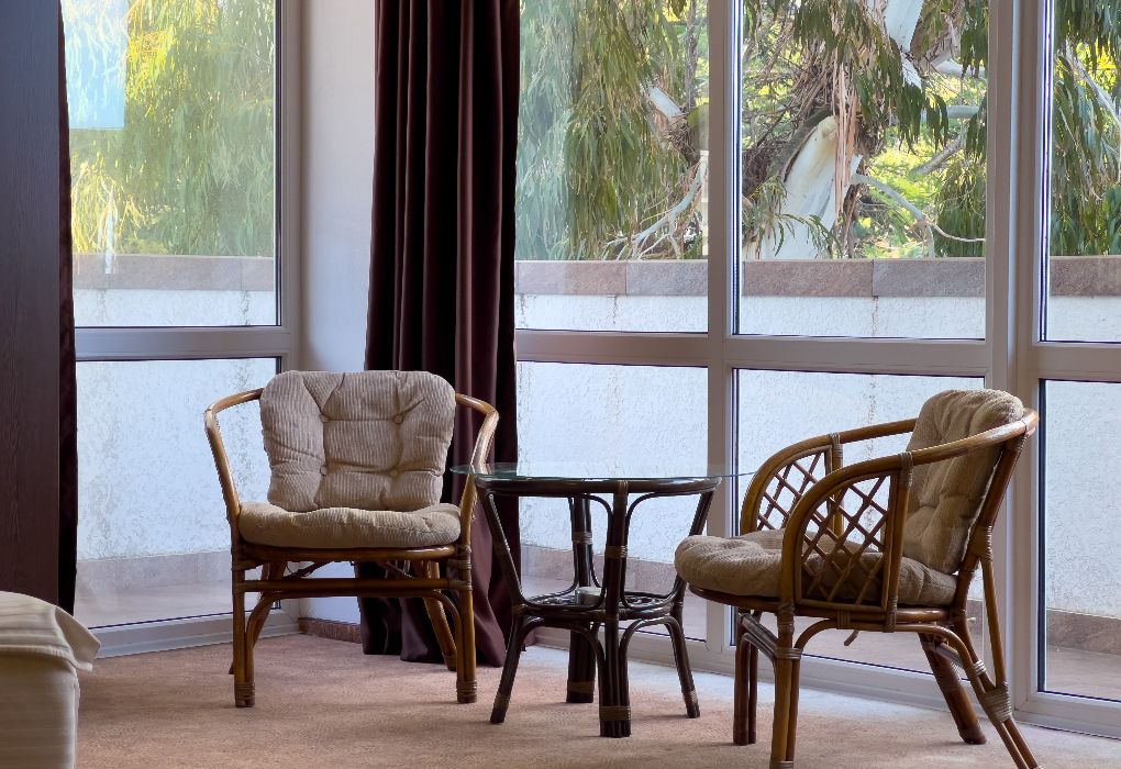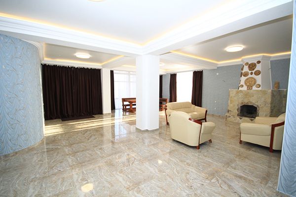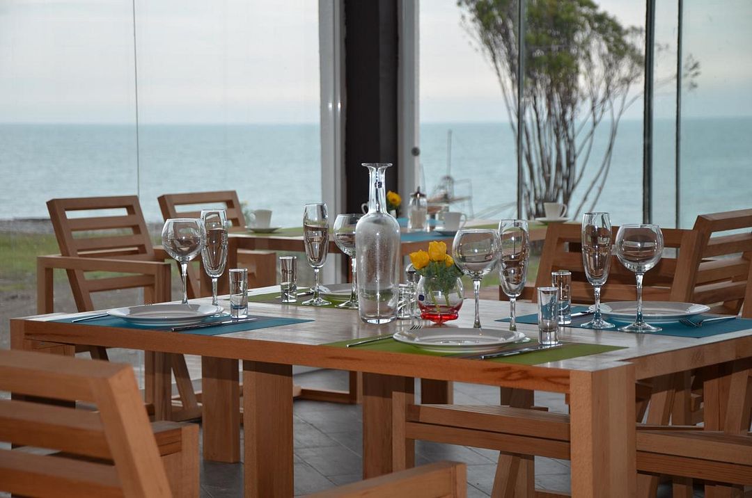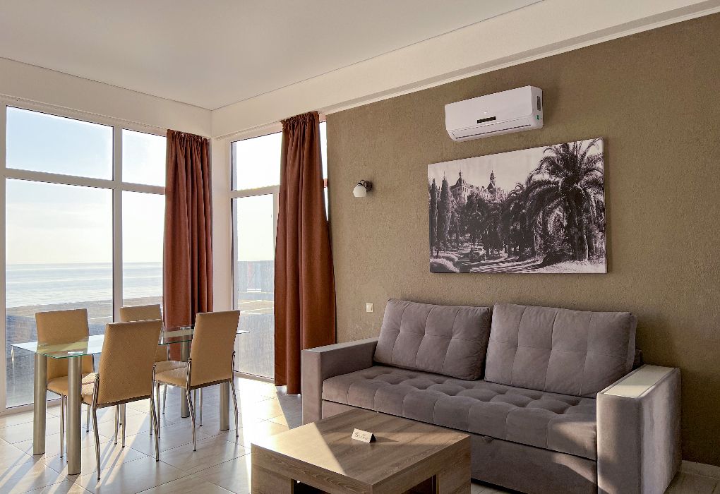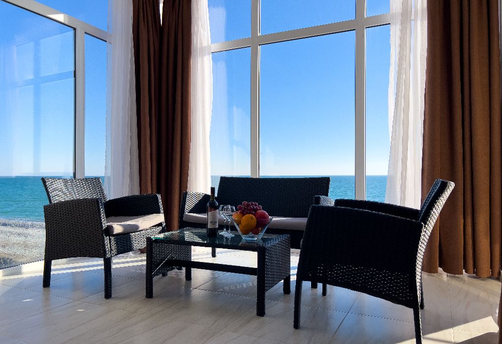 Гостиница отвечает современным требованиям комфорта и безопасности. Высокий уровень сервиса сочетается с удобной планировкой номеров и общественных зон. Гости могут отдохнуть у камина, в окружении картин и фарфорового декора от гудаутского мастера Вадима Аджба. Из панорамных окон и просторных балконов открываются неповторимые виды на чистейшее море и зеленые горы.