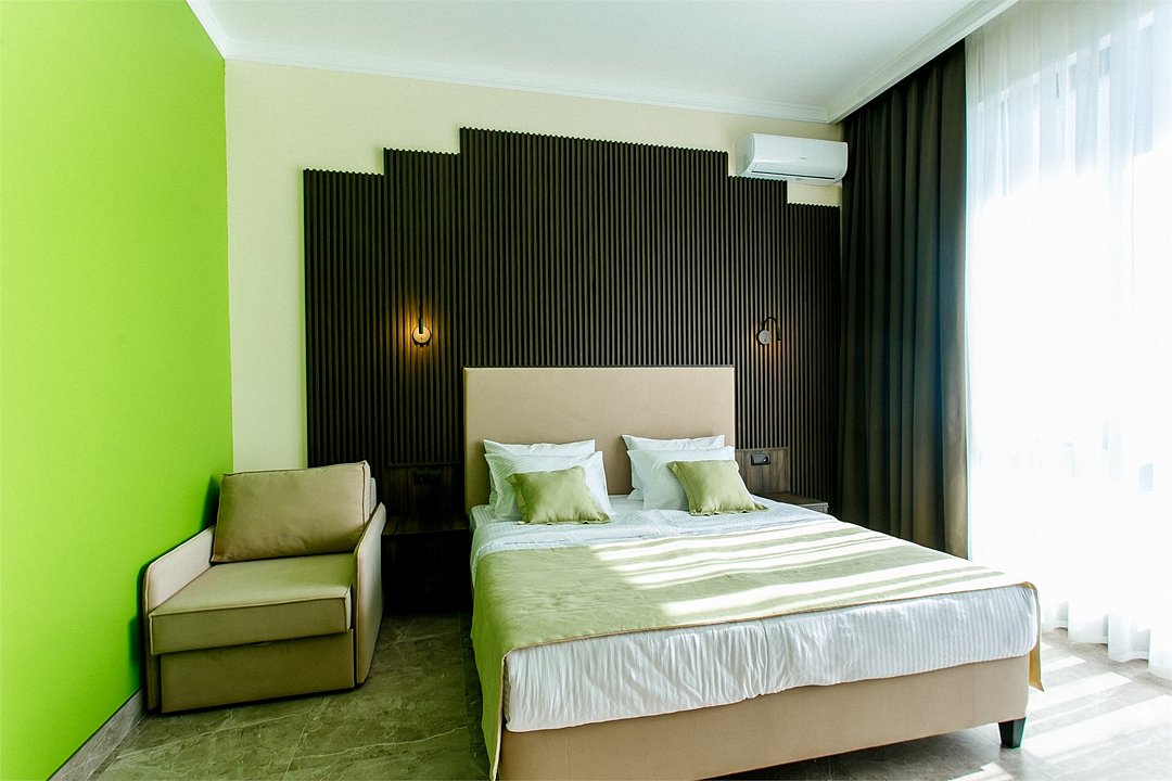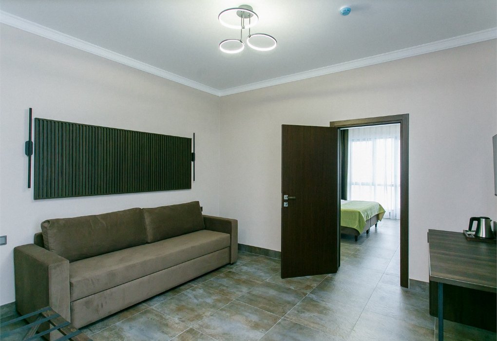 Современный и светлый номер площадью 25 кв. м идеально подойдёт для комфортного размещения как пары, так и семьи с детьми. Интерьер выполнен в спокойных натуральных тонах с яркими акцентами, панорамные окна и выход на балкон с видом на море создают ощущение простора и свежести. Номер состоит из уютной спальни с большой двуспальной кроватью и мягким изголовьем, а также отдельной гостиной зоны, где расположен раскладной диван — удобное дополнительное спальное место. Пространство грамотно зонировано, что позволяет чувствовать себя свободно и расслабленно. В номере есть кондиционер, современное освещение, телевизор, а также всё необходимое для комфортного проживания. Ванная комната оснащена душевой кабиной с тропическим душем, туалетом, полотенцесушителем и полным набором туалетных принадлежностей. Идеальный выбор для тех, кто ищет стильный, функциональный и уютный номер с видом на море.Услуги и удобства