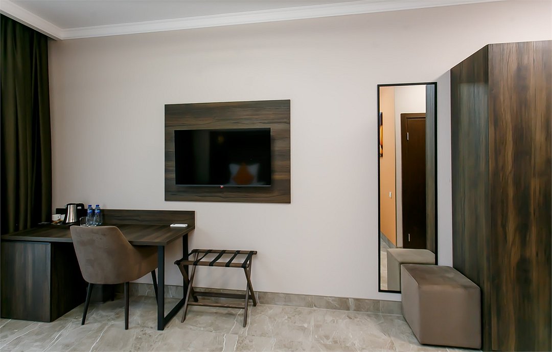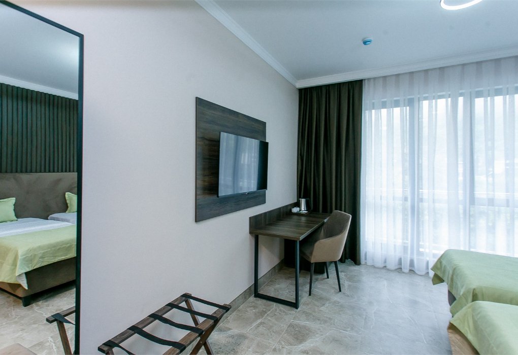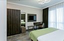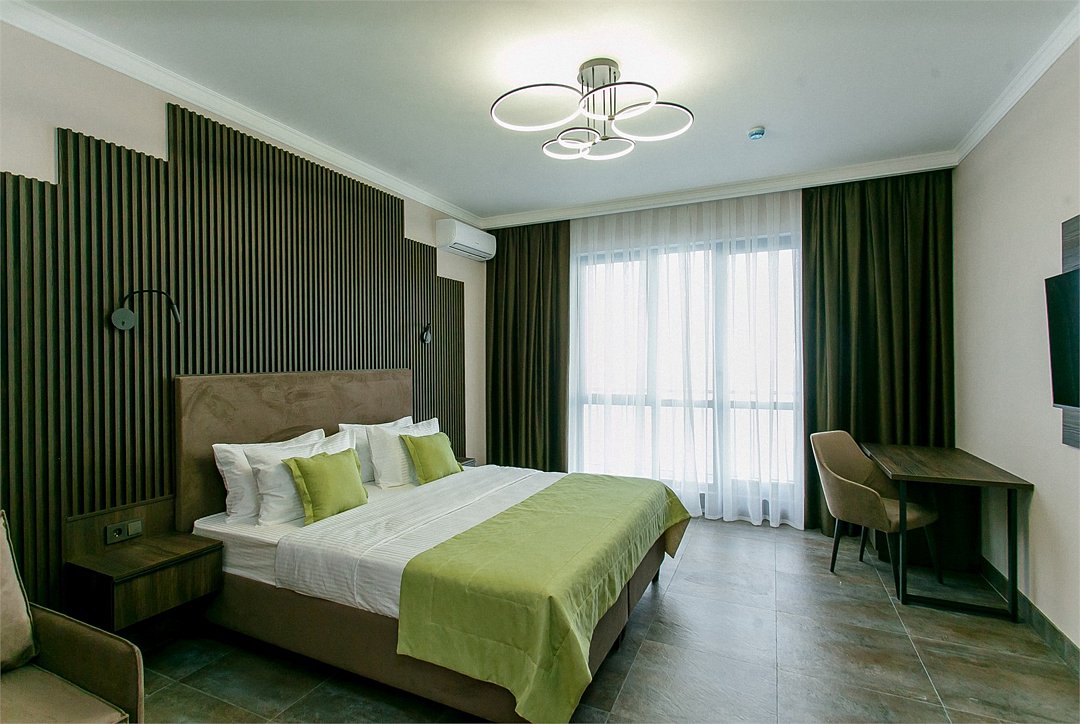 Комфортабельный номер категории комфорт сочетает в себе современный дизайн, функциональность и уют. Просторное помещение с высокими потолками, панорамными окнами от пола до потолка и собственным балконом наполнено естественным светом и открывает живописный вид на парк, создавая атмосферу полного расслабления и уединения. В номере установлена кровать размера Queen size и удобное кресло-кровать, что делает его идеальным как для индивидуальных гостей, так и для семейного размещения. Эксклюзивная мебель, мягкий гарнитур, стулья, тумбы и вместительный шкаф обеспечивают максимальное удобство. Для вашего комфорта предусмотрены: кондиционер, сплит-система, мини-холодильник, сейф, фен, чайная станция с чайным набором, бутилированная вода, электронные замки. В номере работает высокоскоростной Wi-Fi, а для развлечений — телевизор с плоским экраном и функцией Smart TV, а также кабельное и спутниковое телевидение. Ванная комната оборудована душевой кабиной, гигиеническим душем, умывальником, туалетом и унитазом. Гостям предоставляются банные полотенца, тапочки, халаты, мыло, туалетные и гигиенические средства, а также гостиничная парфюмерия. Дополнительные удобства включают ежедневную уборку номера, обслуживание в номер, доступ к услугам электронного консьержа 24/7 и неограниченное посещение СПА. Отель придерживается экологичного подхода к обслуживанию, обеспечивая комфорт с заботой об окружающей среде.Услуги и удобства