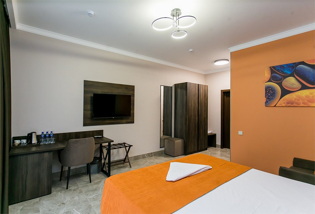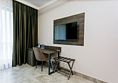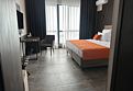 Элегантный номер площадью 18 кв.м выполнен в современном стиле с высокими потолками и панорамными окнами от пола до потолка. Пространство оснащено всем необходимым для комфортного проживания: просторная кровать Queen size, телевизор со Smart TV, кондиционер и система климат-контроля. В номере имеется современная мебель: мебельный гарнитур, мягкая зона с раскладным креслом, вместительные тумбы и шкаф для одежды. Для удобства гостей предусмотрены: мини-холодильник, чайник с набором для приготовления чая и кофе, сейф, фен. Собственная ванная комната оборудована тропическим и гигиеническим душем, укомплектована премиальной косметикой, халатами и тапочками. Дополнительные преимущества: Бесплатный Wi-Fi Звуконепроницаемые окна Круглосуточная служба консьержа Ежедневная уборка Питьевая вода Номер идеально подходит как для романтического отдыха, так и для делового пребывания.Услуги и удобства