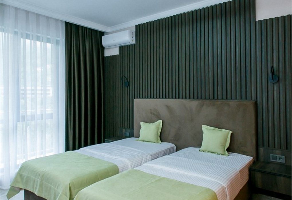 Современный и уютный номер с балконом и видом на парк идеально подходит для комфортного отдыха. Интерьер оформлен в светлых тонах с акцентами натурального дерева и яркими элементами декора, создающими атмосферу свежести и уюта. Высокие потолки и панорамные окна наполняют пространство естественным светом, а выход на балкон позволяет насладиться морским бризом и живописным видом. В номере установлены две односпальные кровати с мягким изголовьем и комплектом подушек. Кондиционер обеспечивает комфортную температуру в любое время года. Ванная комната выполнена в современном стиле и оснащена душевой кабиной с тропическим душем, гигиеническим душем, туалетом, полотенцесушителем и качественной сантехникой. Гостям предоставляются все необходимые туалетные принадлежности. Этот номер станет отличным выбором для тех, кто ценит комфорт, стиль и прекрасные виды на парк.Услуги и удобства