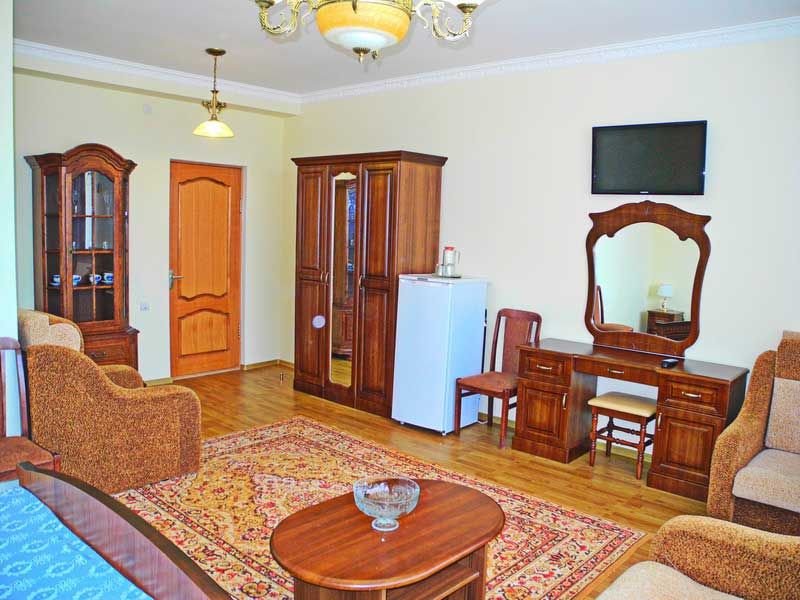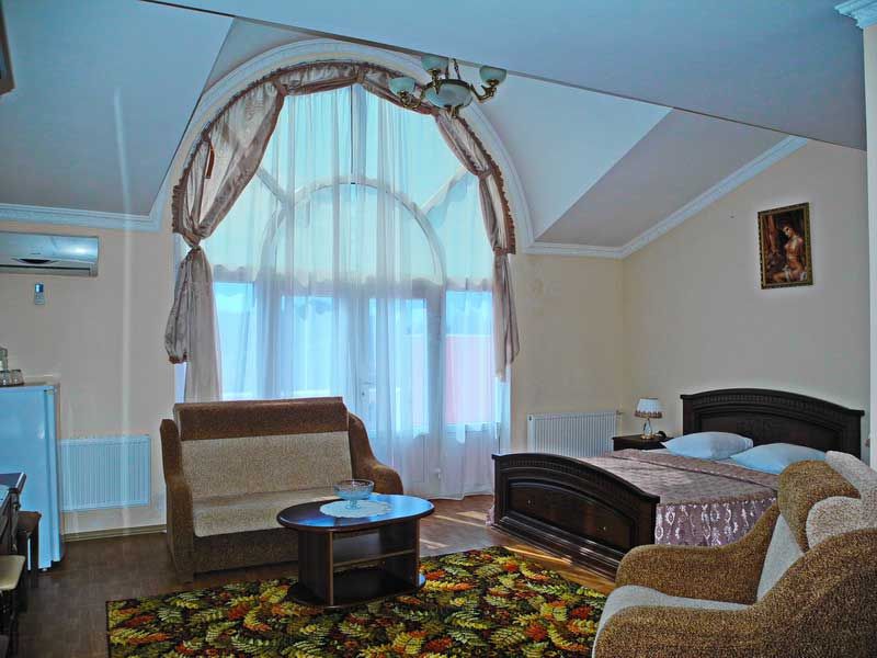Собственная территория гостевого дома «Джугелия» отличается роскошной растительностью, уютом и красотой. Здесь располагается пятиэтажное здание с прекрасным внешним и внутренним дизайном. Это жилой корпус гостевого дома, способного одновременно вместить до 90 человек. Просторные номера различных категорий оборудованы отдельными санузлами и набором необходимой бытовой техники: кондиционером, холодильником, телевизором и wi-fi.