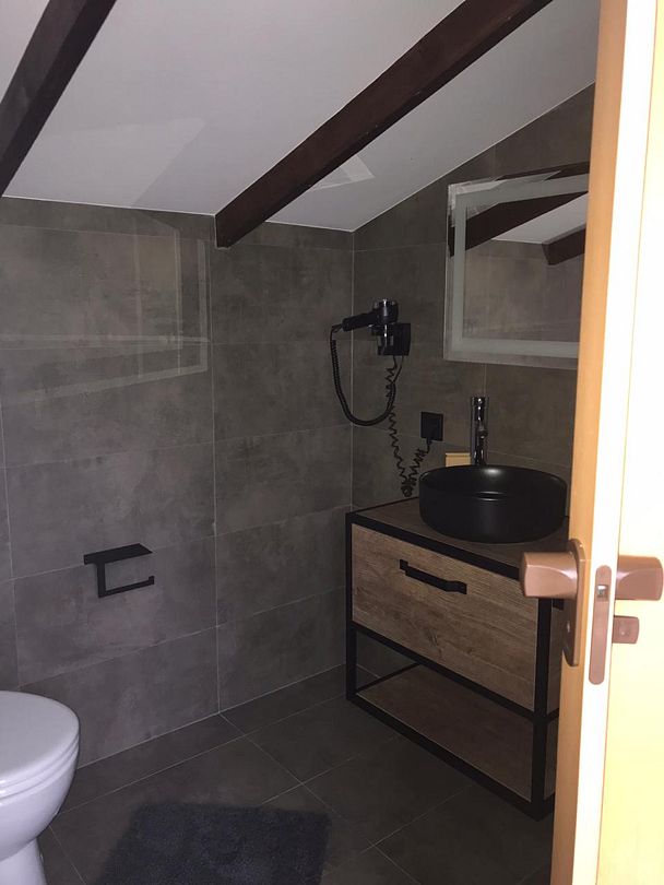 Двухэтажный коттедж оборудован санузлами с новой отлично работающей сантехникой (и хорошим напором воды) на каждом этаже, холодильником, стиральной машиной, посудой, утюгом и гладильной доской.