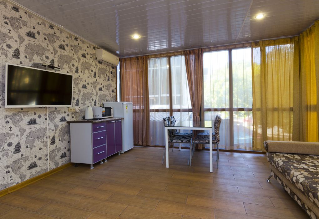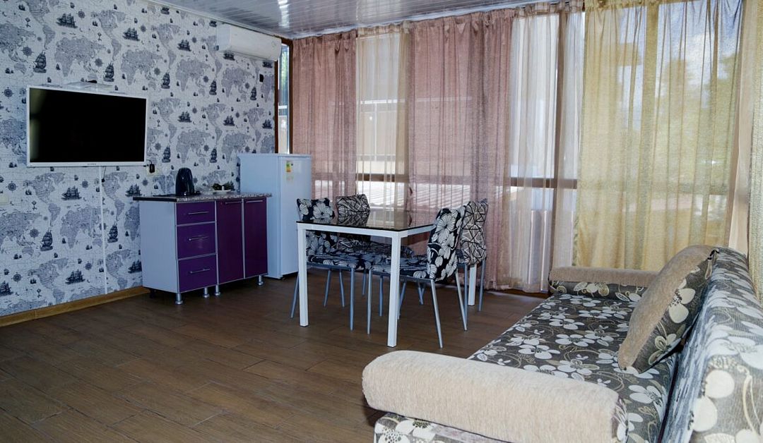 Wi-Fi, холодильник, кондиционер, фен, банные полотенца, двуспальная кровать, две односпальные кровати, диван, стулья, шкаф для одежды, обеденный стол, кресло, вид во двор, санузел на этаже, телевизор с плоским экраном, душ на этажеВ гостиничном номере