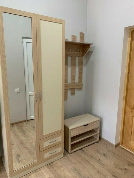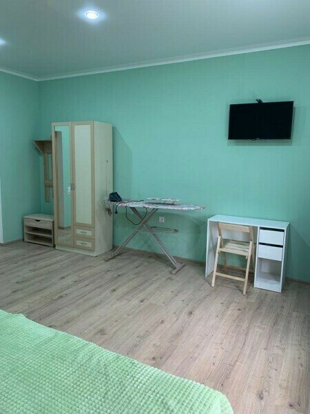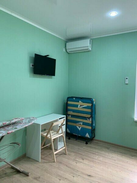 Имеется телевизор, кондиционер, шкаф, вешалка, зеркало, рабочий стол, стулья, корзина для мусора.