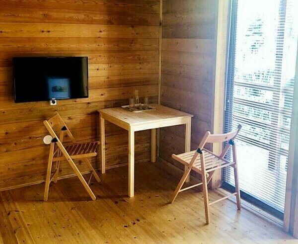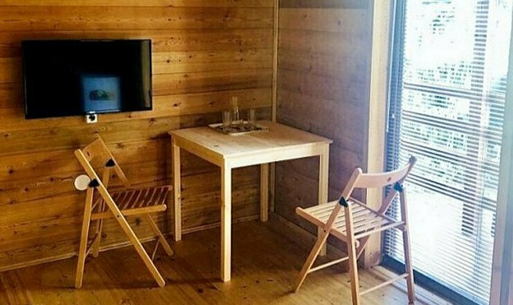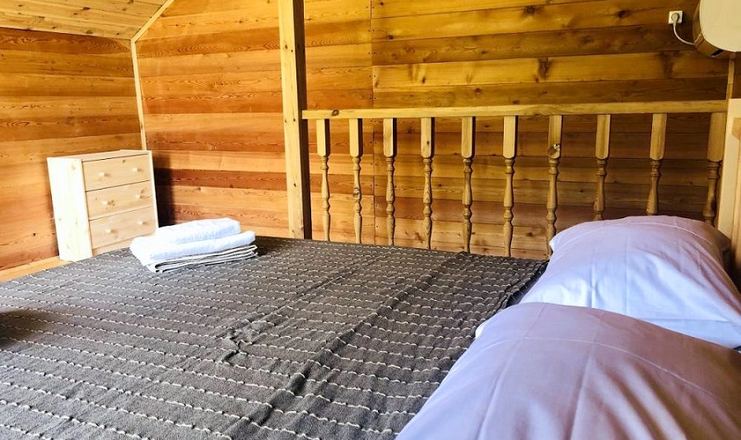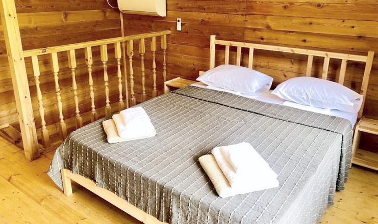 В каждом коттедже на втором этаже расположена спальня, на первом этаже находится гостиная и санузел.