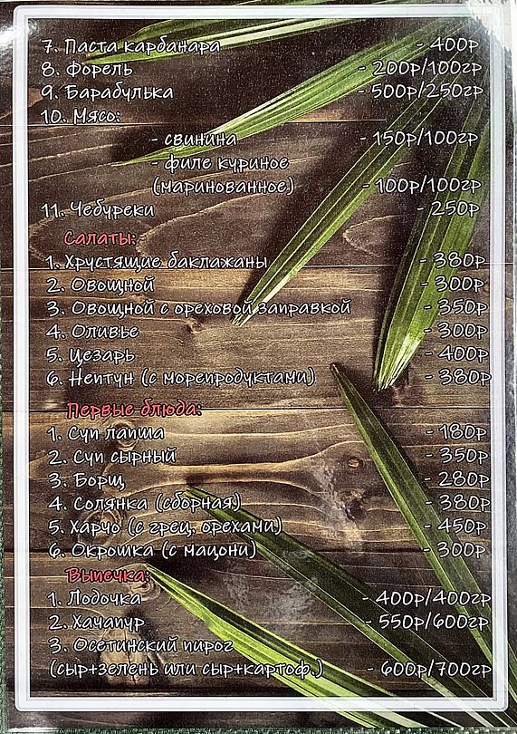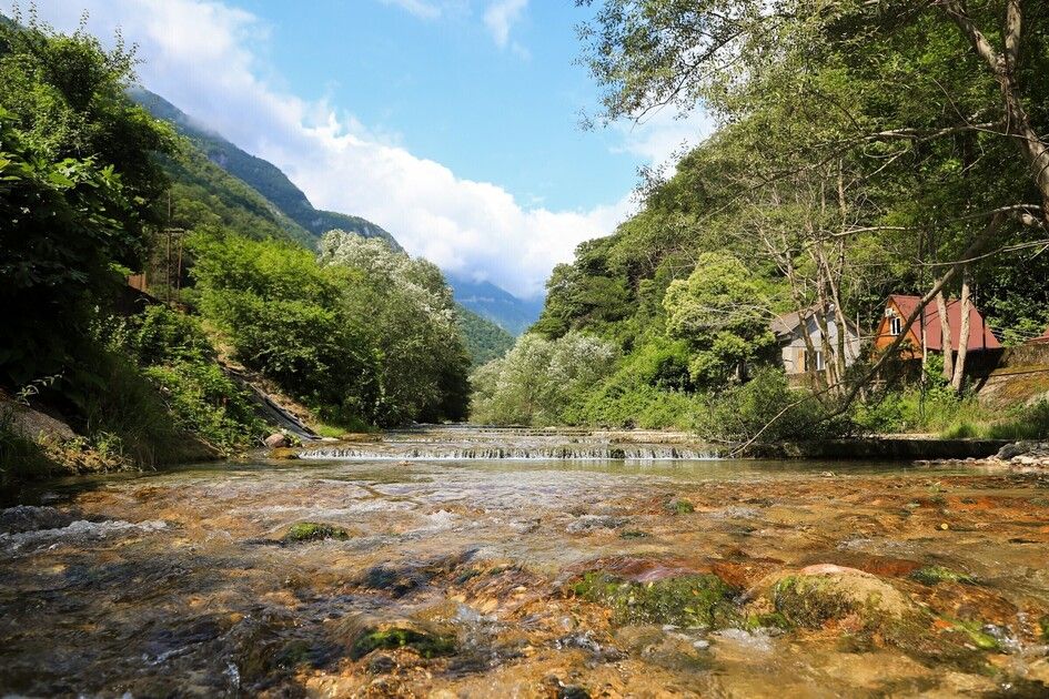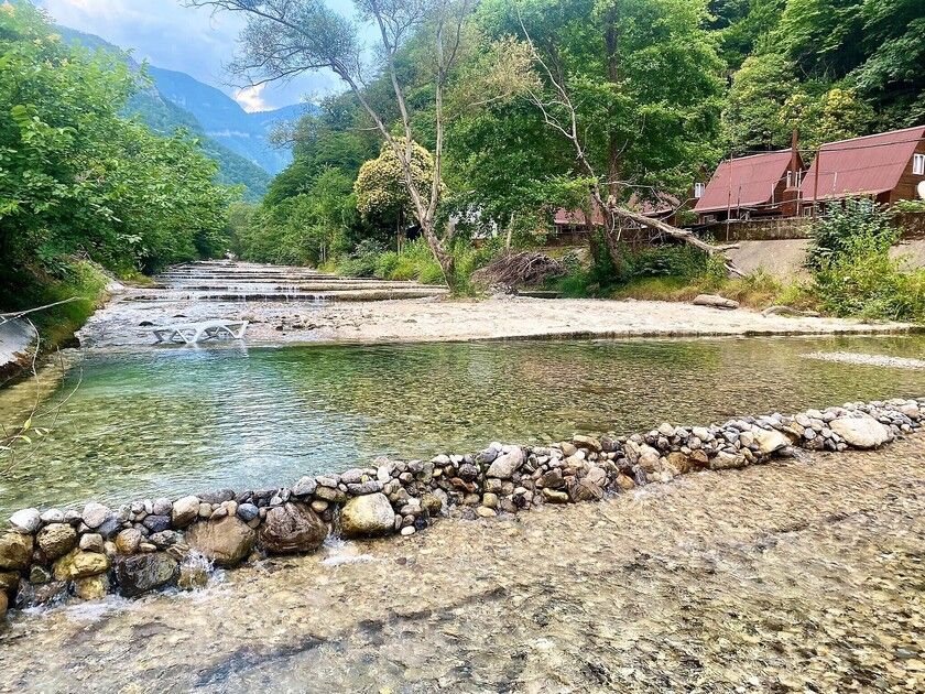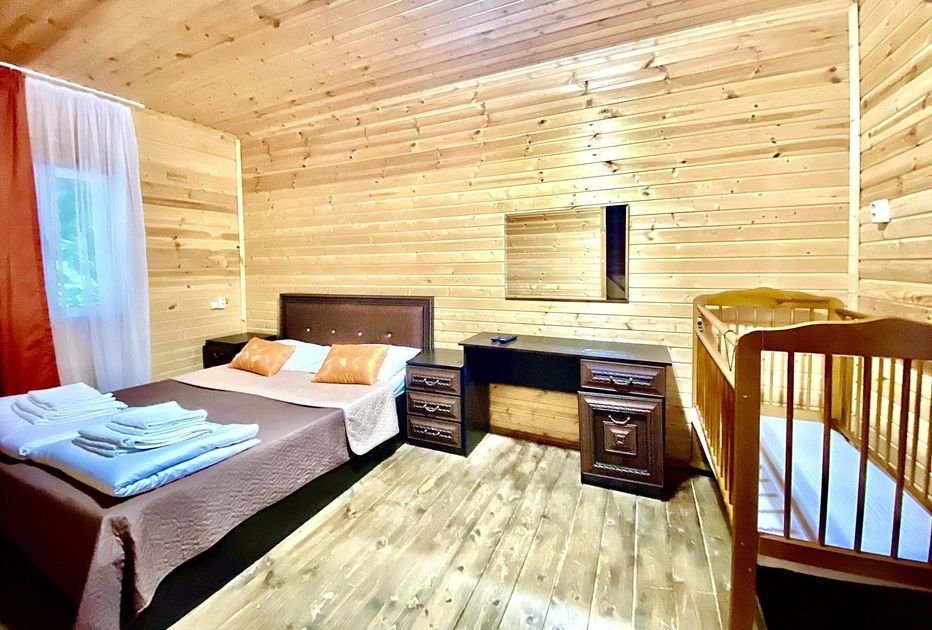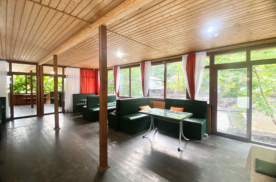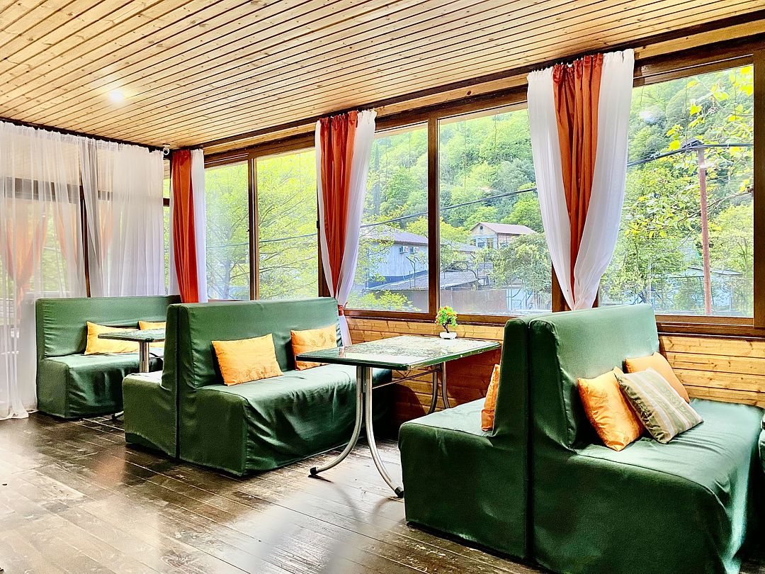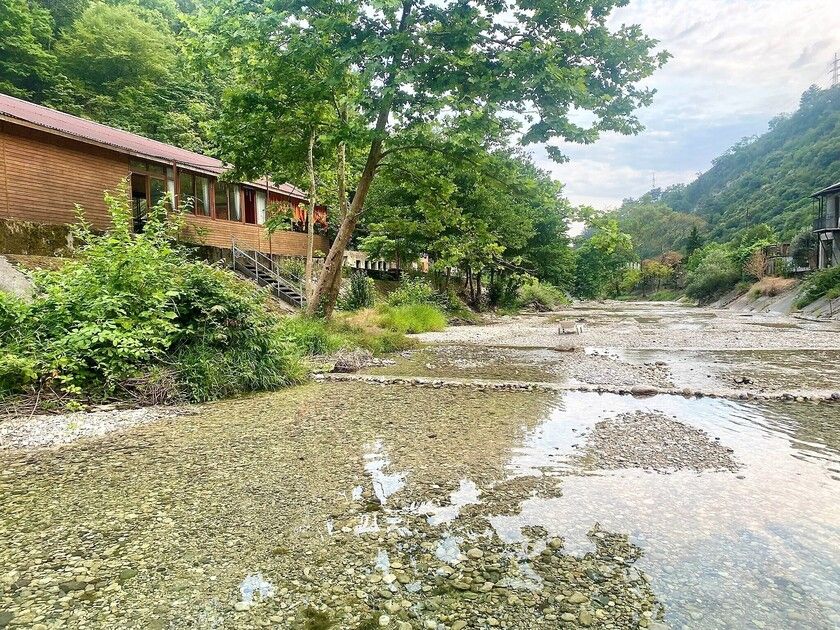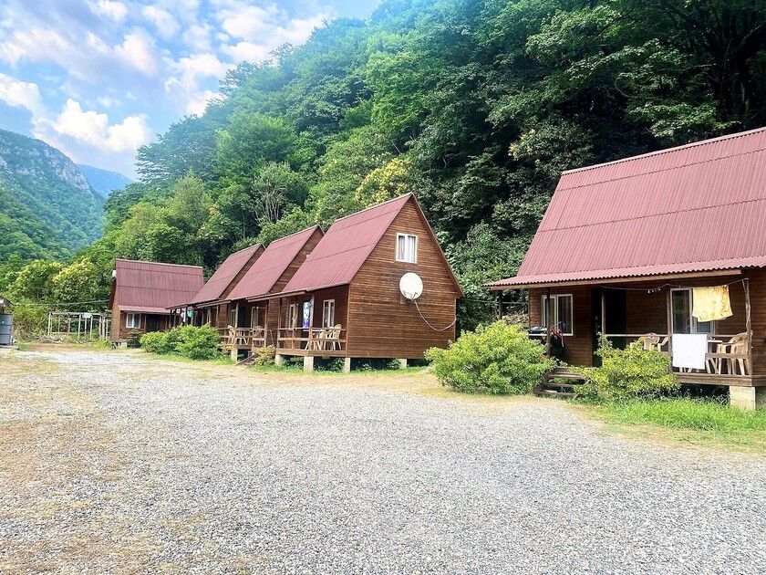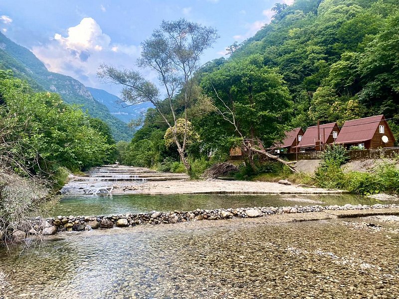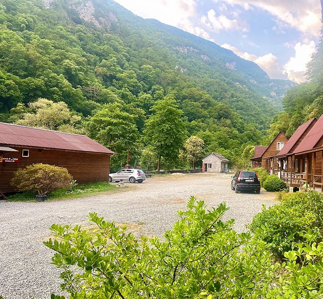 Путешествие с семьейОтличный отдых для семьи с детьмиОтдыхали с 25.06.по 06.07 двое взрослых, двое детей ( мальчишки 7 лет и 4 года) в деревянном двухэтажном домике. В домике чисто, белье и полотенца белоснежные. Есть кондиционер. Проблем с водой горячей или холодной не было. Заказывали на Букинге. База расположена в ущелье на берегу речки. Место потрясающее! Спокойно, тихо, птички поют, речка журчит, территория закрытая. Домиков немного, нет суеты. Детям раздолье, огромная площадка для игр. Нет такой жары как в городе. Воздух чистый, горы, зелени много. Спится хорошо. Для взрослых прокат велосипедов, конные прогулки, пешие в горы по тропам. Питались мы только на базе. Завтрак был включен. Каша, блины, яичница, омлет сосиски. Мы ежедневно ели блинчики, дети кашу и блинчики. Кашу можно заказать любую. Меню обеда и ужина всегда согласовывалось с нами. Детям мы заказывали еду, привычную для них. Салаты разнообразные, супы, горячие вторые блюда с мясом, либо овощные. Ужины тоже разнообразные, включали национальную кухню. Персонал очень внимательный. Карине спасибо, терпеливо отвечала на все наши вопросы еще до заезда. Спасибо всему персоналу за отдых, настроение, питание. Кате особое спасибо, она и готовила и обслуживала нас, и развлекала, и угощала. Мы и наши дети с ней подружились. Руслан постоянно нам помогал, добрый, внимательный молодой человек. До моря с детьми далековато, но нас это не пугало, лишний раз пешком прогуляться вдоль речки очень полезно. Море чистое! Пляж хороший, но не оборудованный. Лежаки и навесы для гостей отеля. Кто не может на солнце, располагаются под деревьями. Пляж песок с галькой, вход в море камешки, желательно обувь иметь. Детям всеравно, бегают по камешкам как по песку. Народу немного, места достаточно. Никакого рото вируса не на базе, не на пляже! Хотя в отзывах читали, что в отелях многие болели. Возле пляжа веревочный парк. Рядом Приморский парк, там есть аттракционы, зоо уголок, разнообразные деревья. Ездили в аквапарк в новой Гагре, возле него хорошая детская площадка. База функционируют второй год, очень много планов в отношении ее дальнейшего развития у учредителей, строительство ресторана и гостиничных номеров для двоих, бассейна. Желаем им успехов во всех делах, исполнения задуманного! Рекомендуем базу отдыха для семей с детьми.