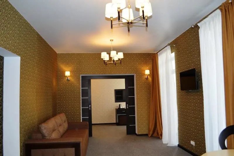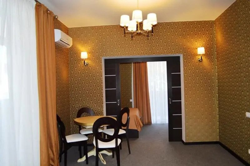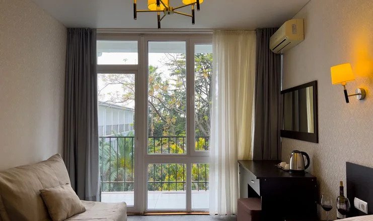 В спальне с уютным интерьером вас ожидают двуспальная кровать и двуспальный диван. Также в номере есть терраса и отдельный вход. В вашем распоряжении телевизор, кондиционер, москитная сетка, плотные шторы, шкаф, вешалка, обеденный, рабочий и журнальный столы, а также посуда, столовые приборы, чайник, холодильник и стулья.