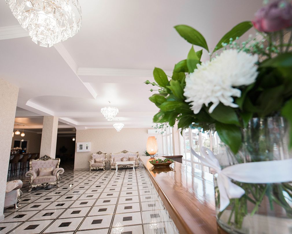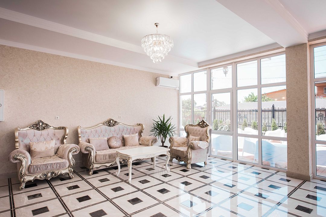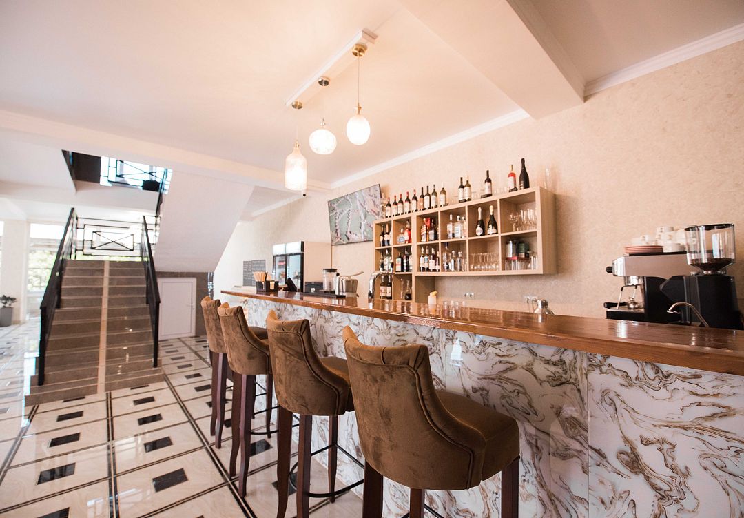 Стильные интерьеры, добротная мебель в холле. Здесь есть бар с коктейльной картой, рекомендую попробовать домашнее белое вино, оно реально очень хорошее.