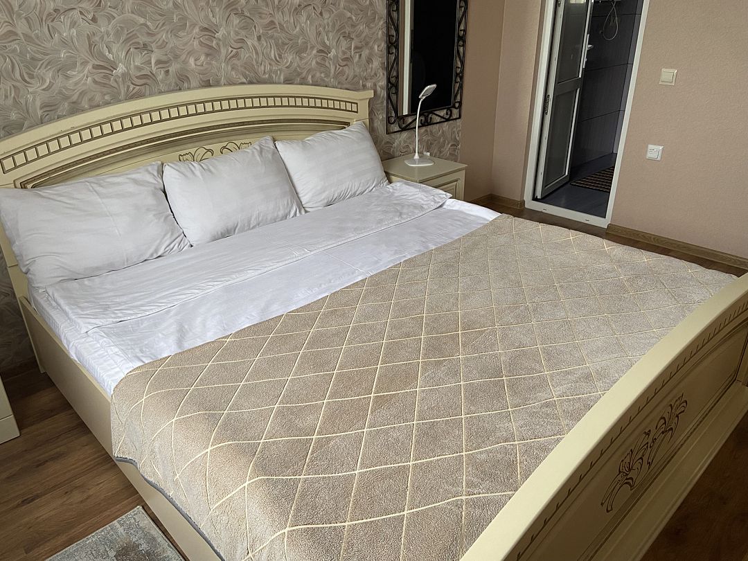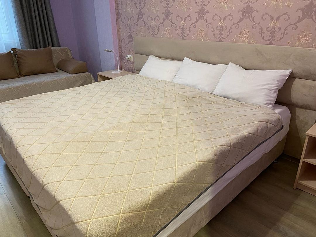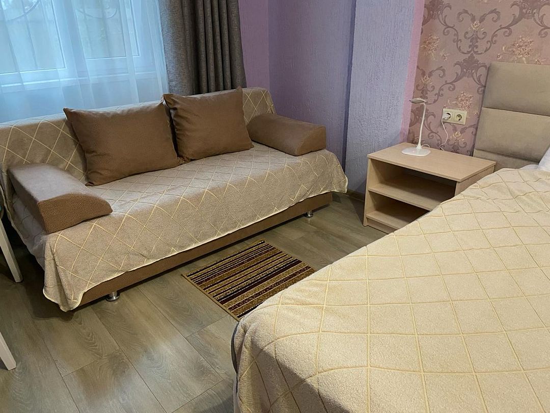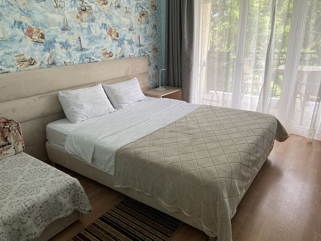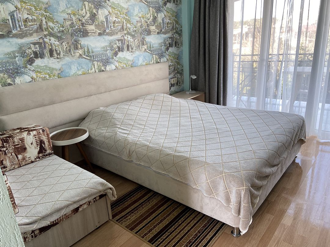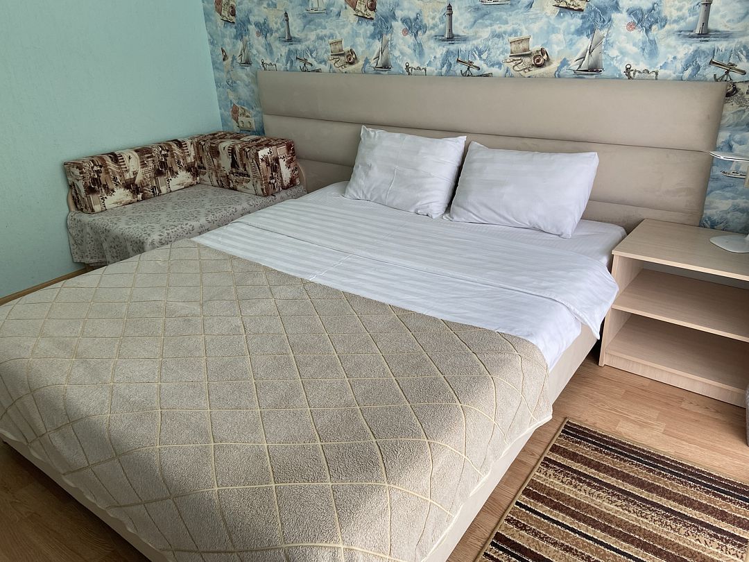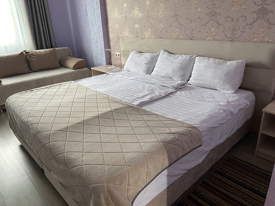 Номер в большой кроватью, раскладывающимся диваном, вмещает до 5 гостей, из них 4 с местом.В гостиничном номере
