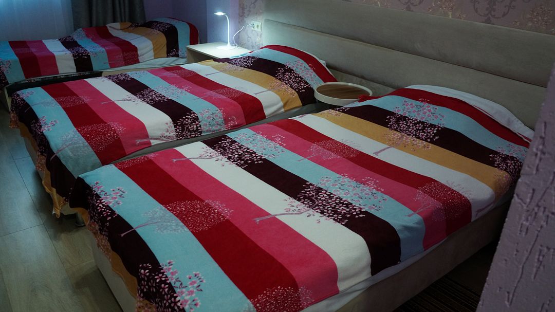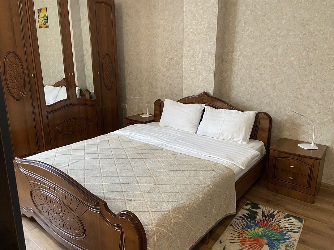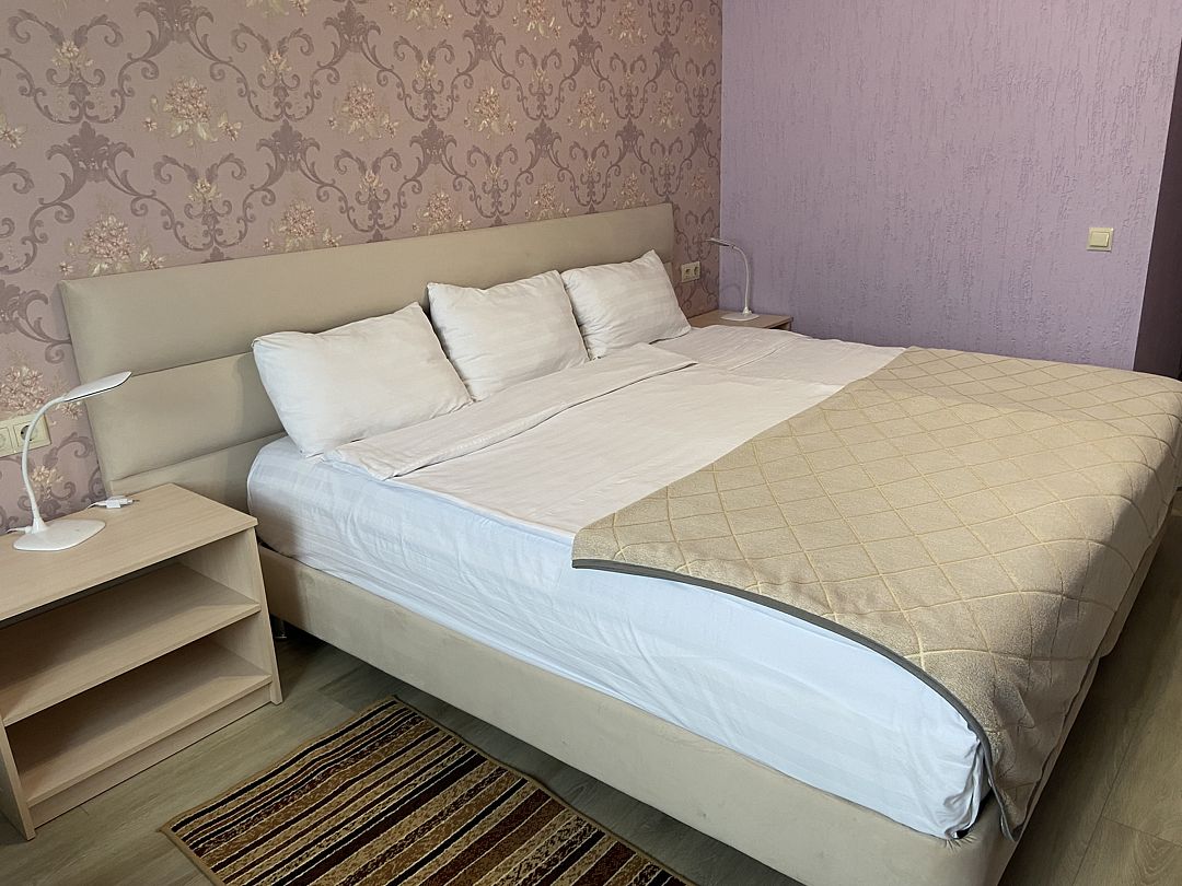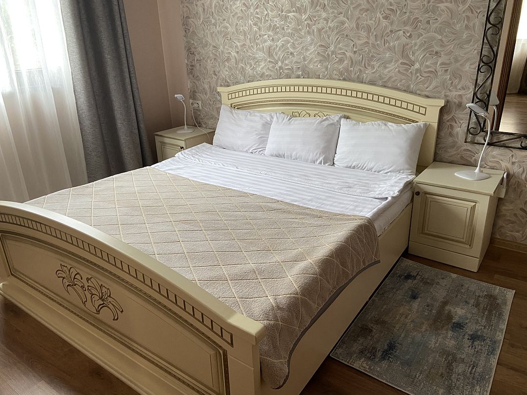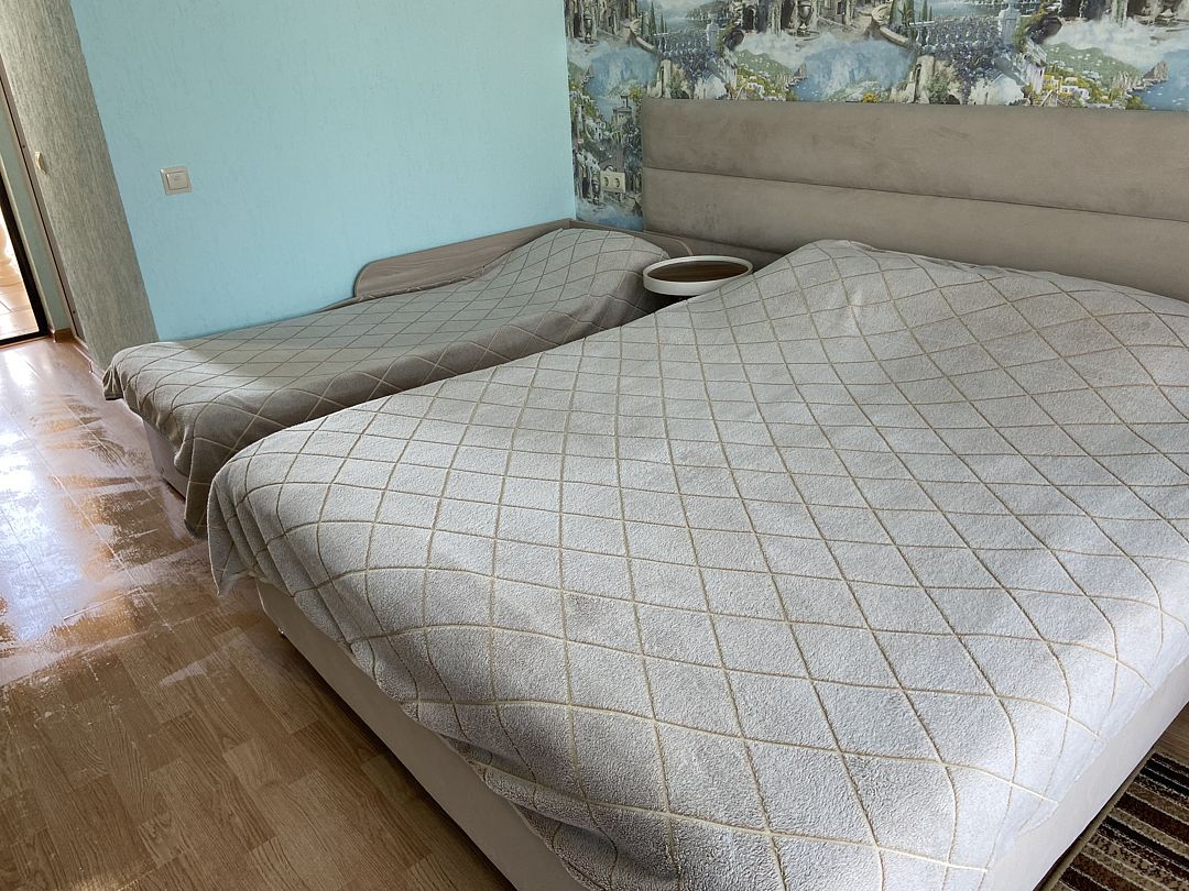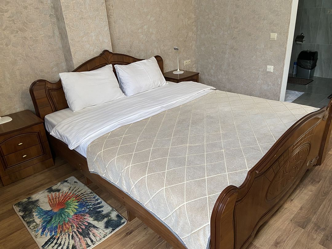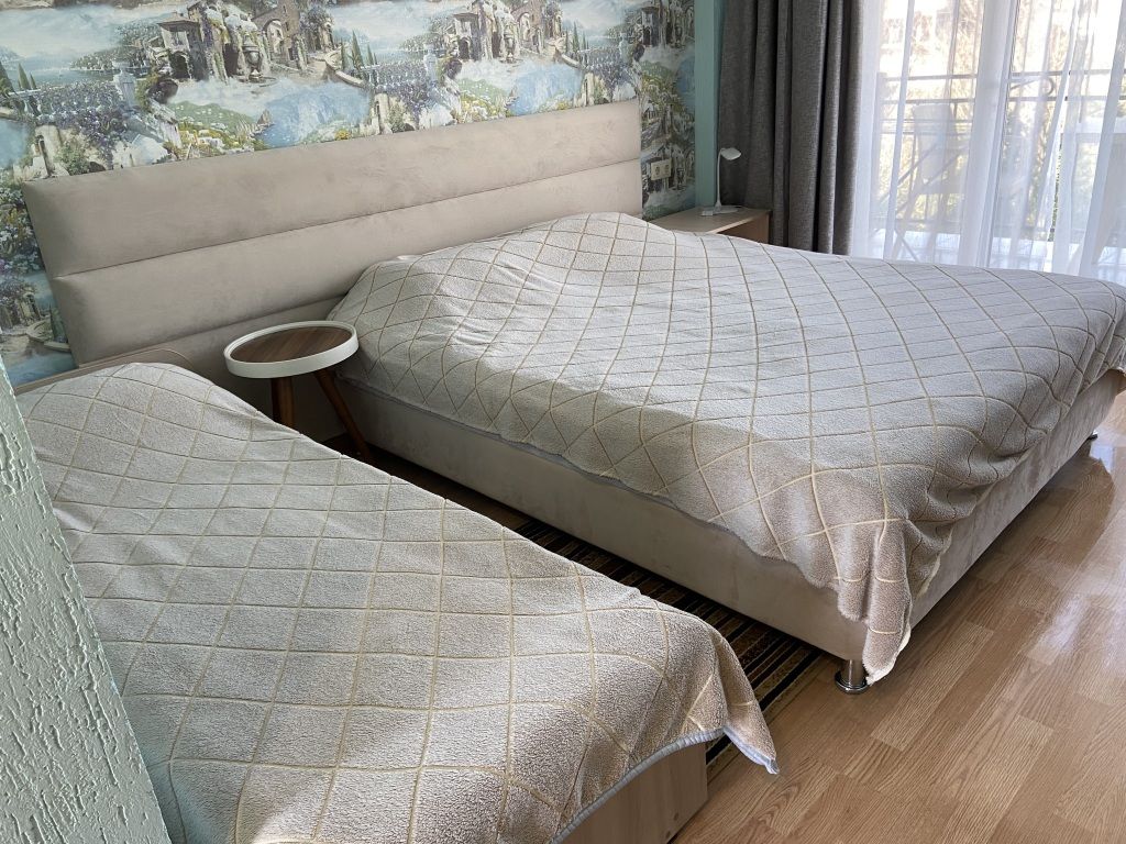Номер в большой кроватью, раскладывающимся диваном, вмещает до 5 гостей, из них 4 с местом.В гостиничном номере