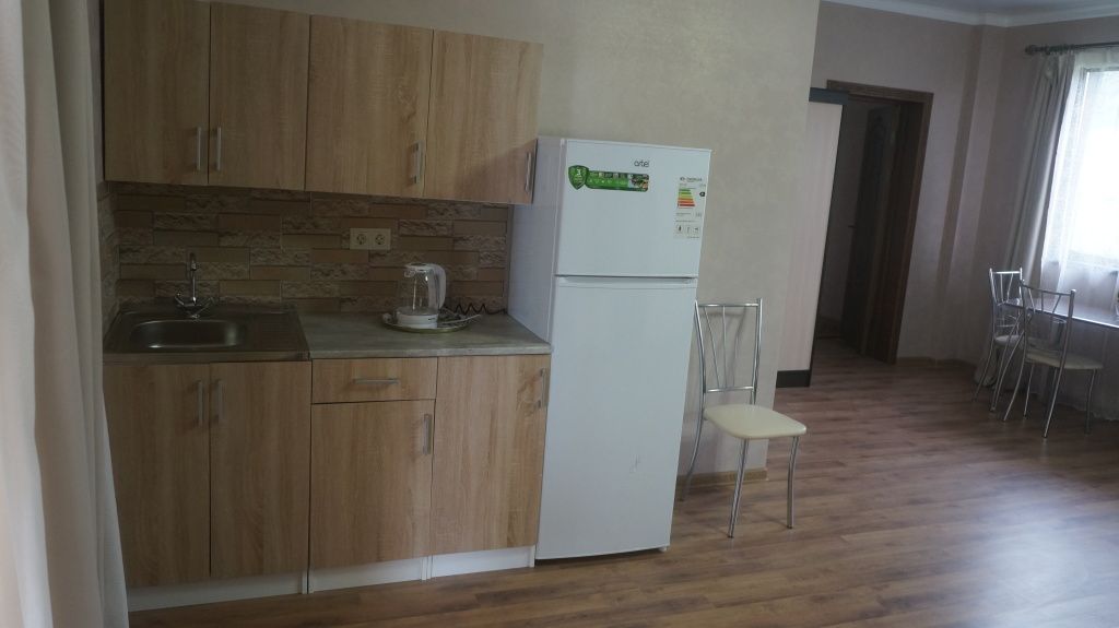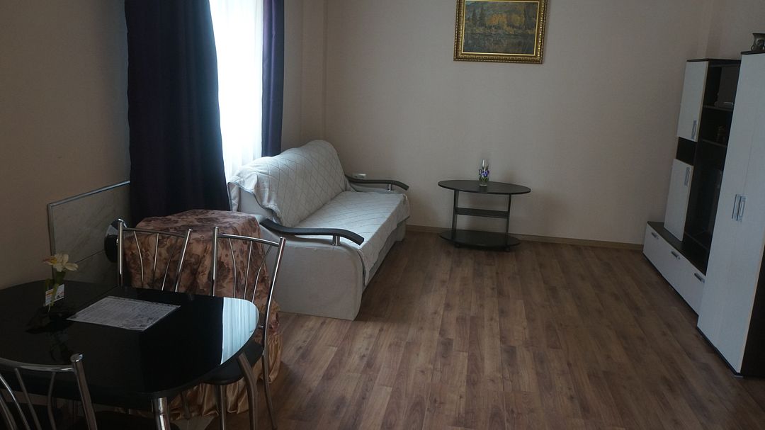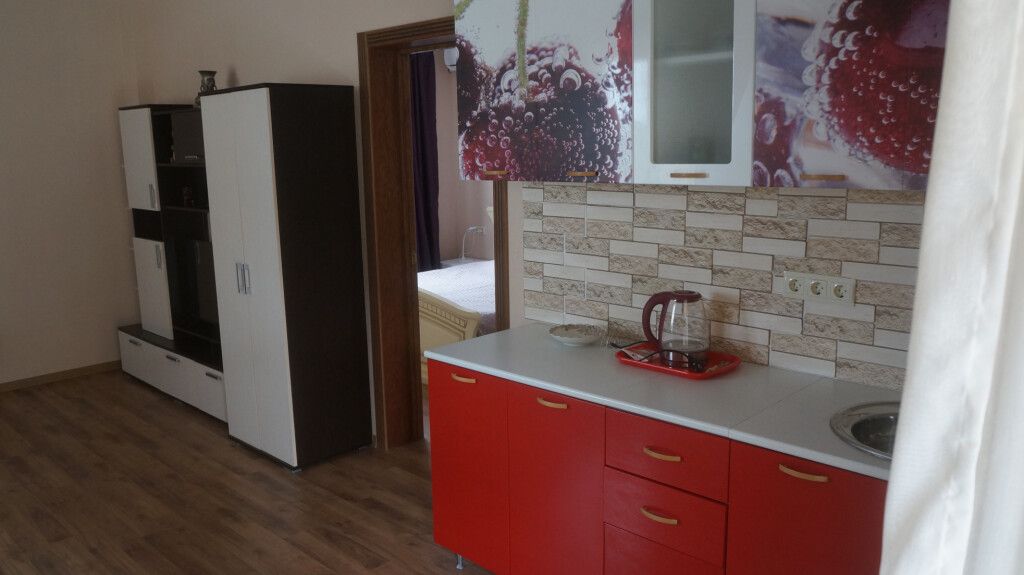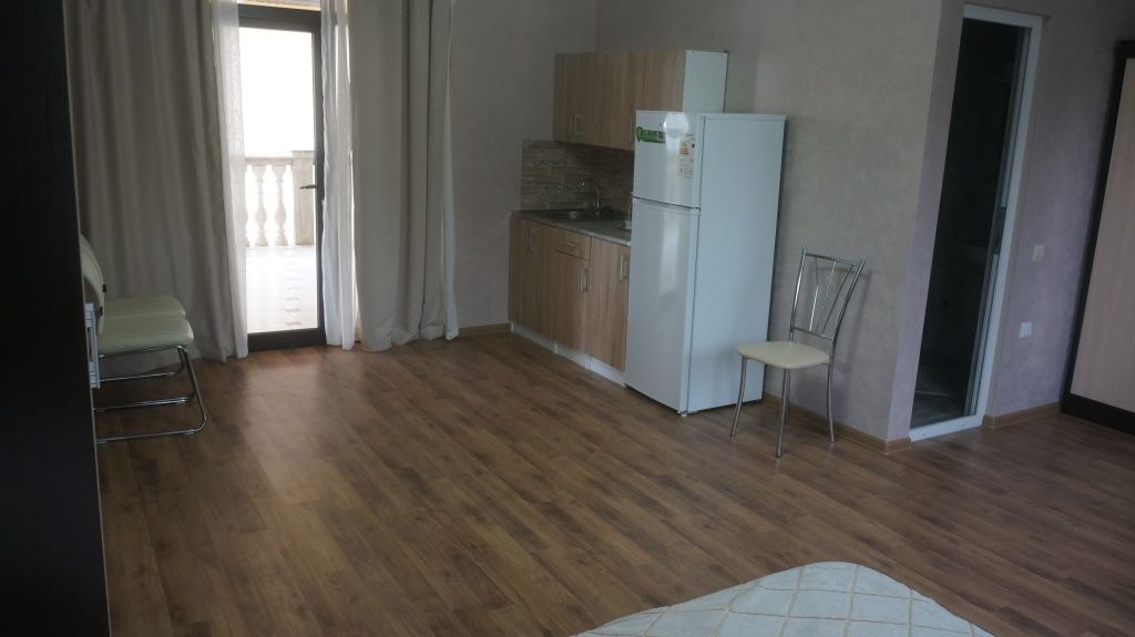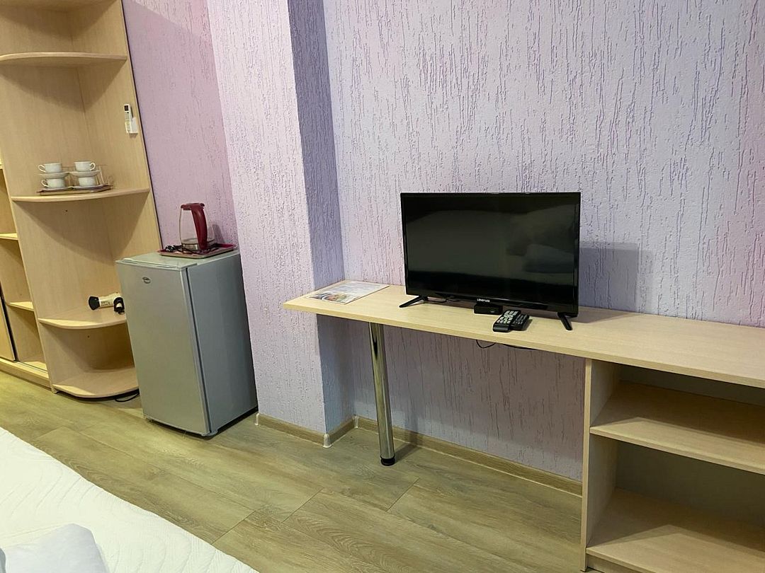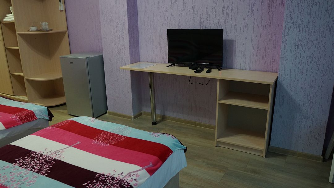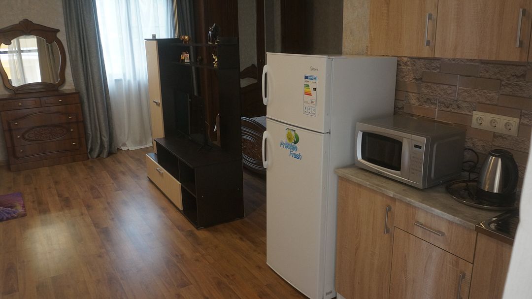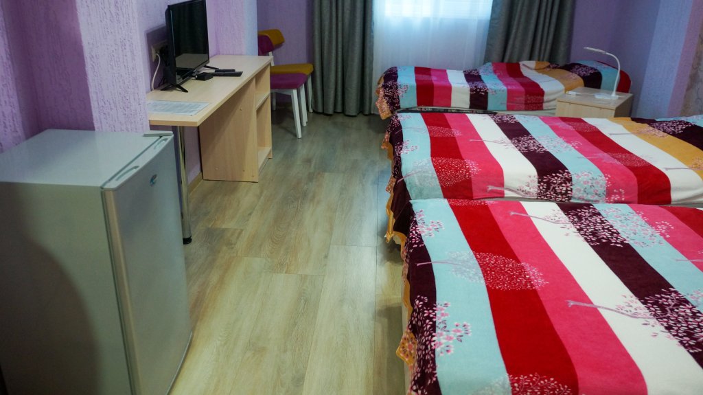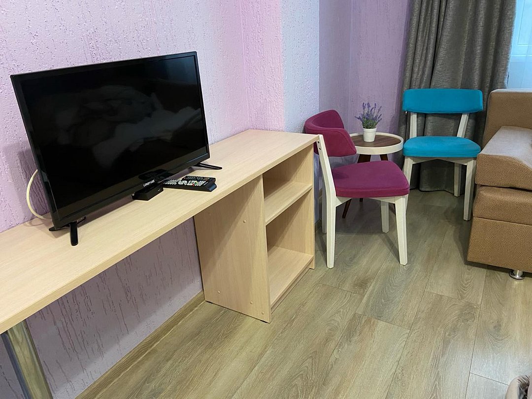 Просторный номер с двумя зонами. Возможно проживание 4-х гостей. Номер оборудован мини-кухней, холодильником, кондиционером, телевизором и мебелью для комфортного проживания.В гостиничном номере