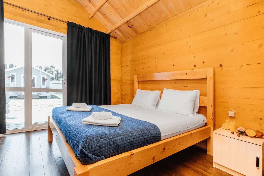 Просторные домики подходят для размещения 2-4х человек. В номерах двуспальная кровать и двухъярусная кровать. Из техники: кондиционер, телевизор и холодильник. В ванной комнате есть всё необходимое.