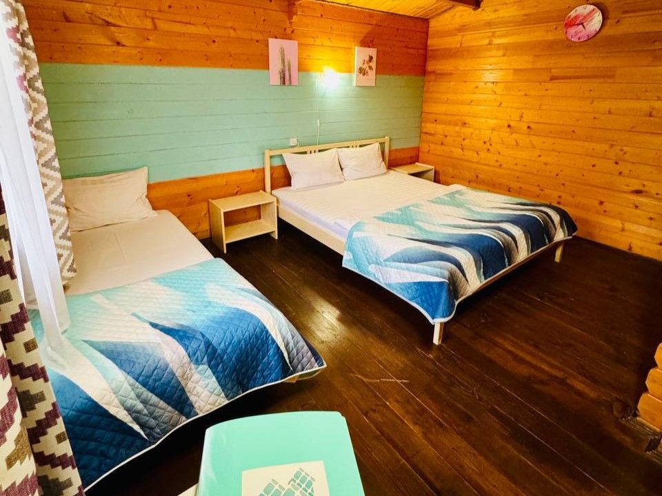 На территории доступны общая кухня для самостоятельного приготовления еды и столовая зона. Есть просторный зелёный двор с мангалом, барной зоной, шезлонгами и креслами-мешками для отдыха, баня и детская площадка и уголок для спорта.