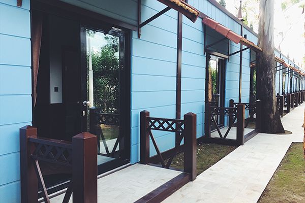 Рядом с отелем также находятся магазины, рынок, аптеки и остановки общественного транспорта. Российско-абхазская граница находится всего в полчаса езды от отеля. Гостиница представляет собой одноэтажное деревянное здание, расположенное на первой береговой линии среди вечнозеленых эвкалиптовых рощ.