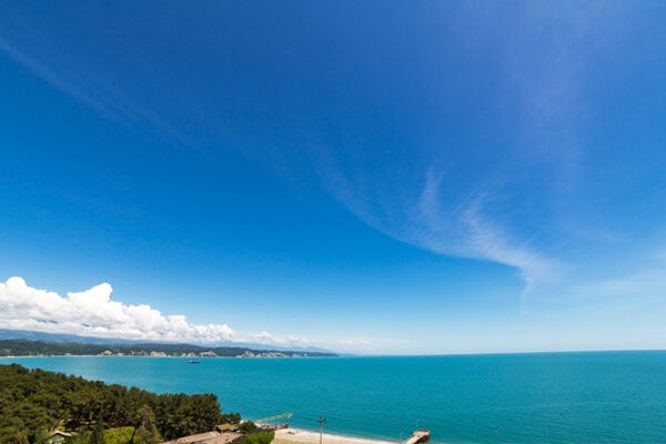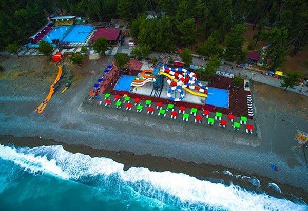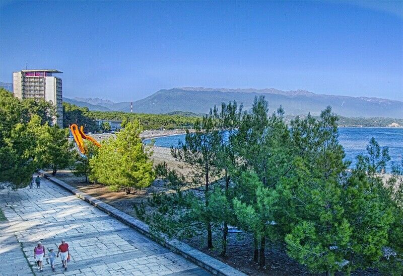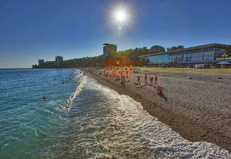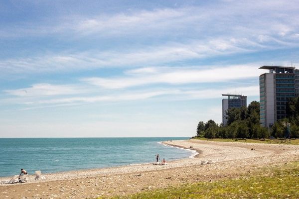 Ближайший к «Пицунде» пляж находится в ста метрах от спальных корпусов. Он закрыт для посторонних и располагает шезлонгами, зонтами, кабинками для переодевания и туалетом.