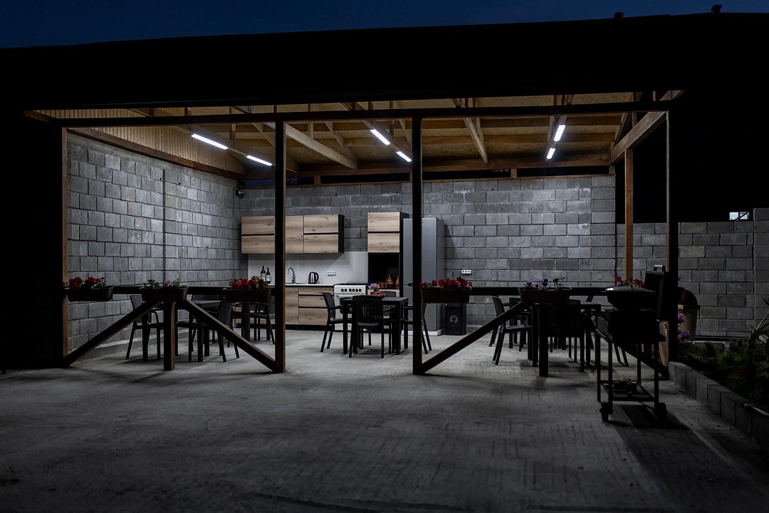 На территории комплекса есть открытая кухня с техникой и мебелью, отдельная зона барбекю и детская площадка.