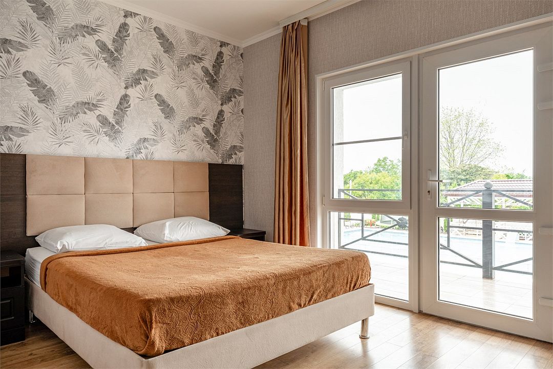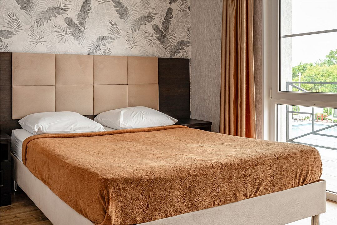 Номер оформлен в классическом стиле с элементами деревянной мебели. В комнате установлена двуспальная кровать с прикроватными тумбами, что обеспечивает удобство во время отдыха. Просторное окно обеспечивает хорошее естественное освещение. Ванная комната оформлена в теплых бежевых тонах и оснащена современной сантехникой. Оснащение номера: Двуспальная кровать Шкаф для одежды Кондиционер Телевизор Санузел с душевой кабиной Зеркало ТумбыУслуги и удобства