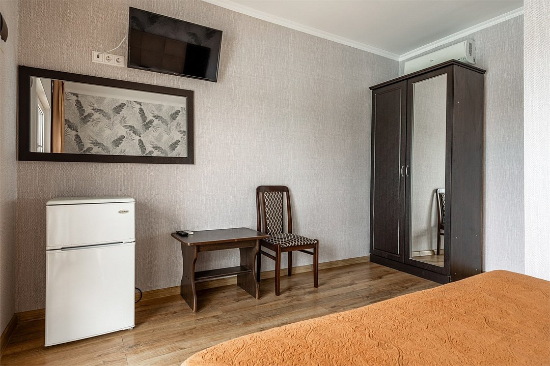 телевизор, Wi-Fi, кондиционер, душевая кабина, санузел, банные полотенца, двуспальная кровать, две односпальные кровати, тумбы, шкаф для одежды, вешалки, звуконепроницаемые стены и окна, обслуживание номеров, раковина, косметическое зеркало, питьевая вода, вид во двор, ламинат, стаканы, стул, тумба, сушилка для белья, мини-холодильник, уборка номера, вода из артезианской скважиныВ номере