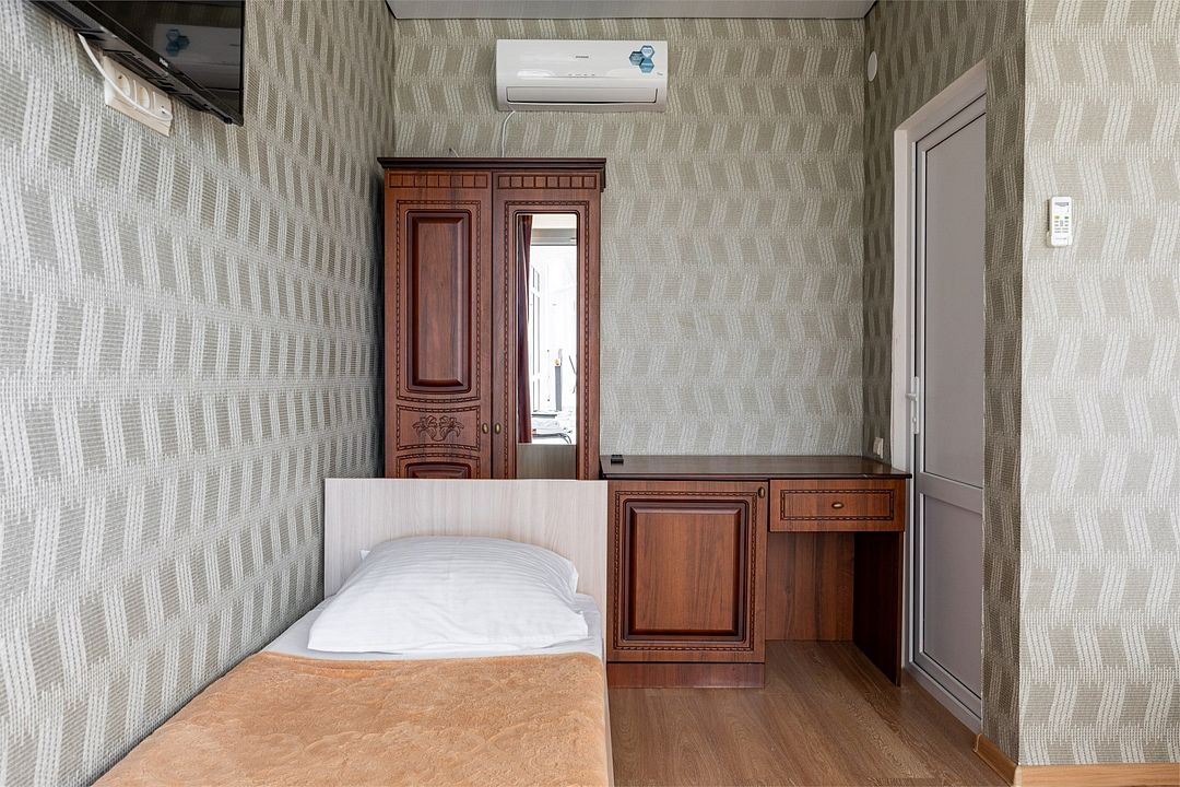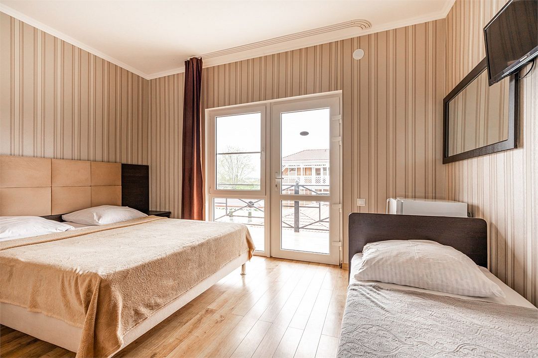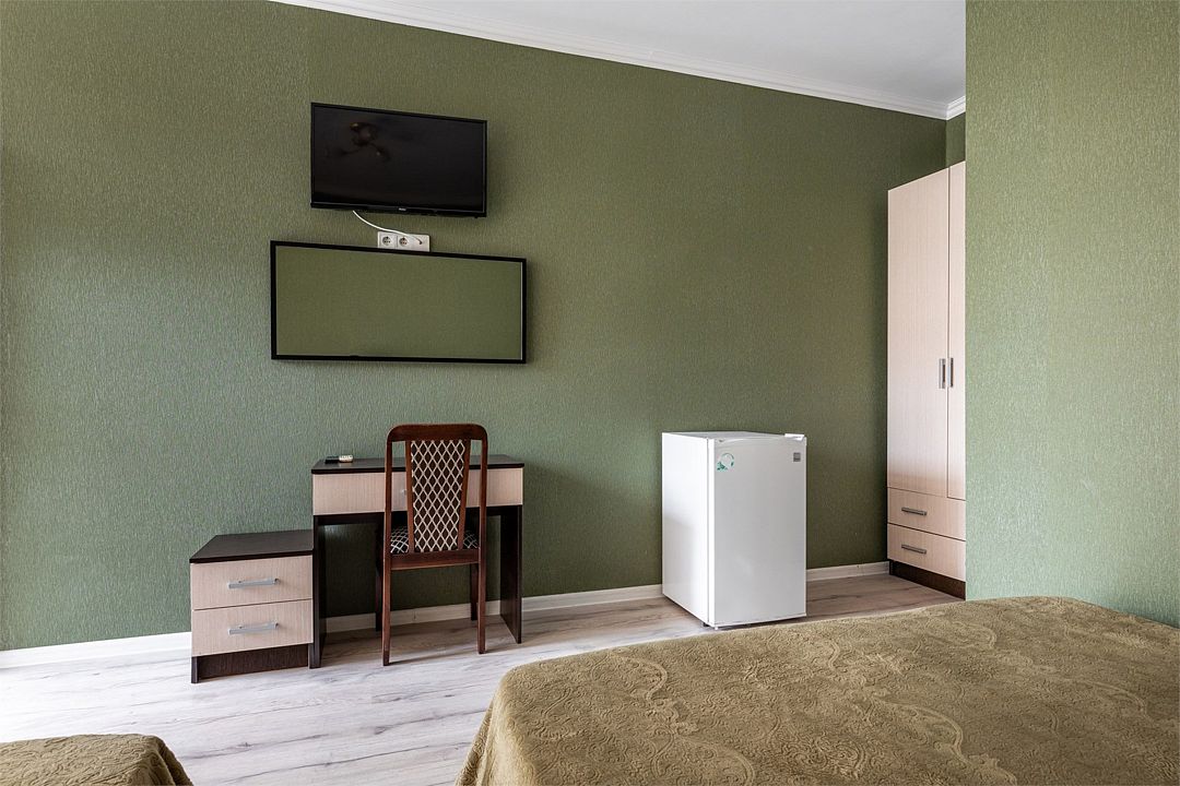 телевизор, Wi-Fi, кондиционер, душевая кабина, санузел, банные полотенца, двуспальная кровать, две односпальные кровати, тумбы, шкаф для одежды, вешалки, звуконепроницаемые стены и окна, обслуживание номеров, раковина, косметическое зеркало, питьевая вода, вид во двор, ламинат, стаканы, стул, тумба, сушилка для белья, мини-холодильник, уборка номера, вода из артезианской скважиныВ гостиничном номере