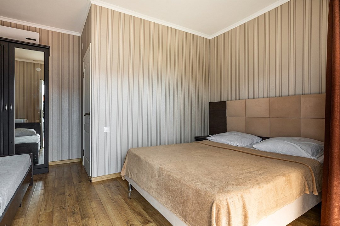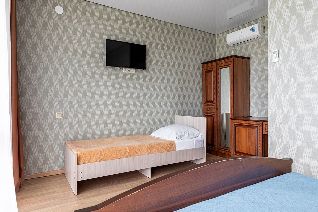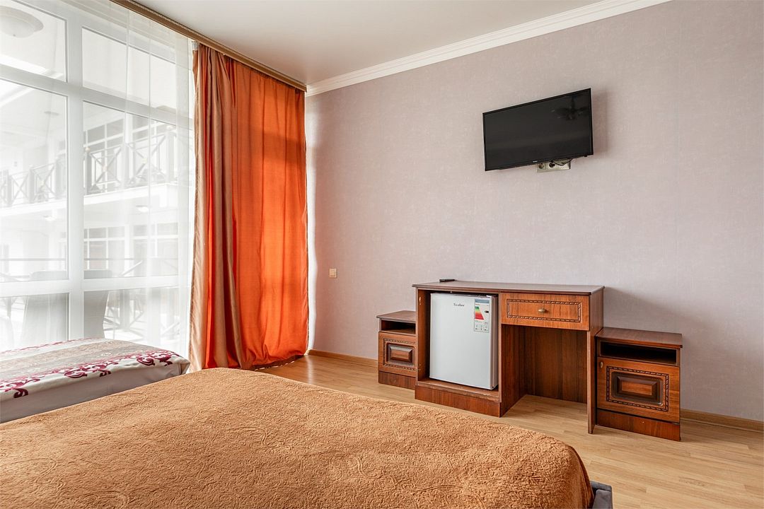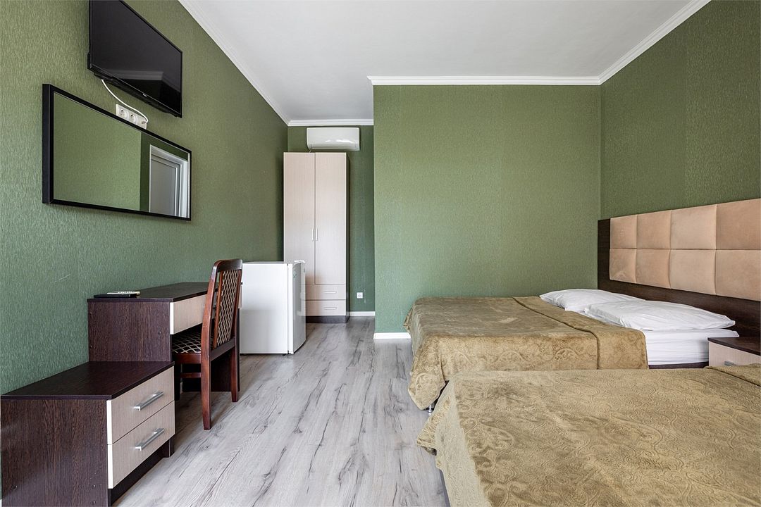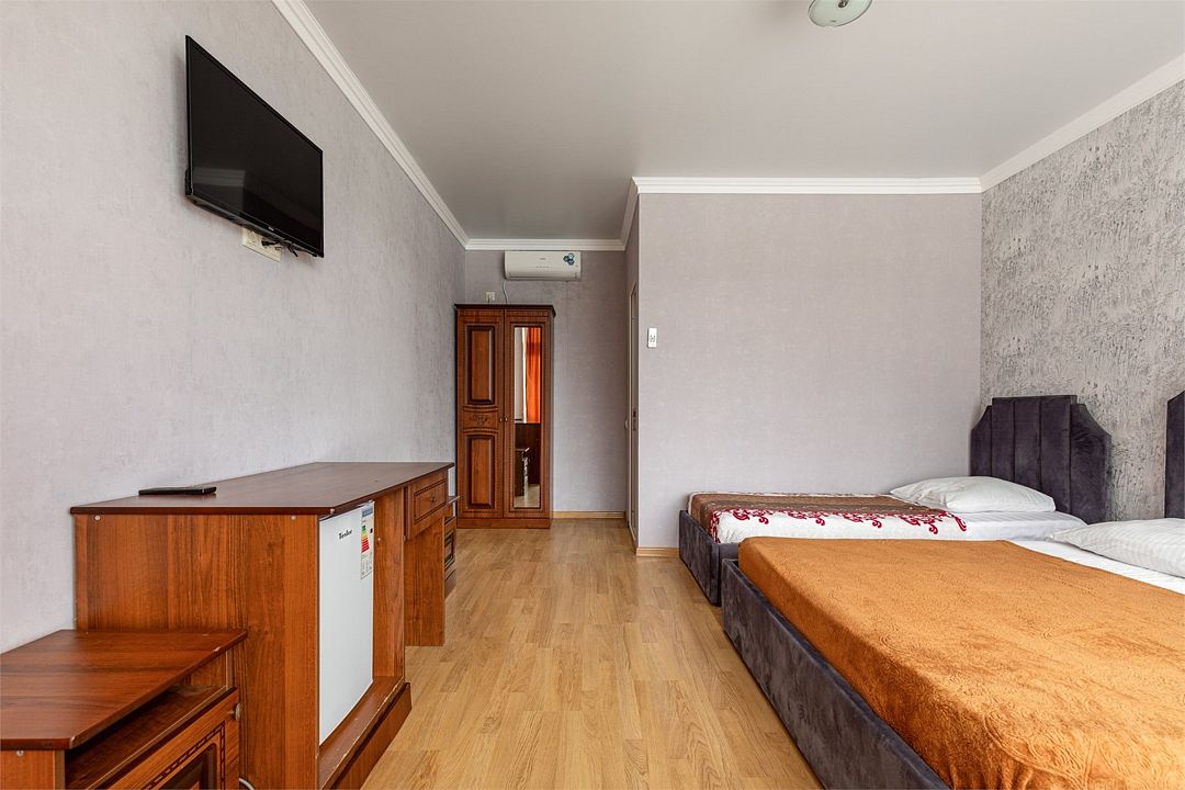 В номере: одна двуспальная кровать и одна односпальная кровать, прикроватные тумбы, шкаф, стол, холодильник, санузел, душ, кондиционер, Wi-Fi, телевизор.Услуги и удобства