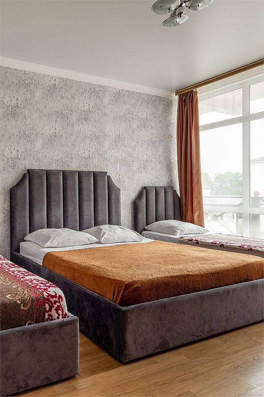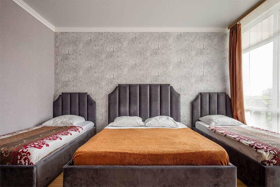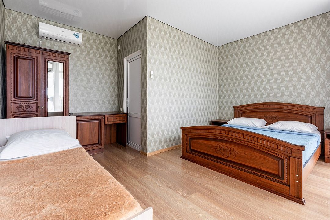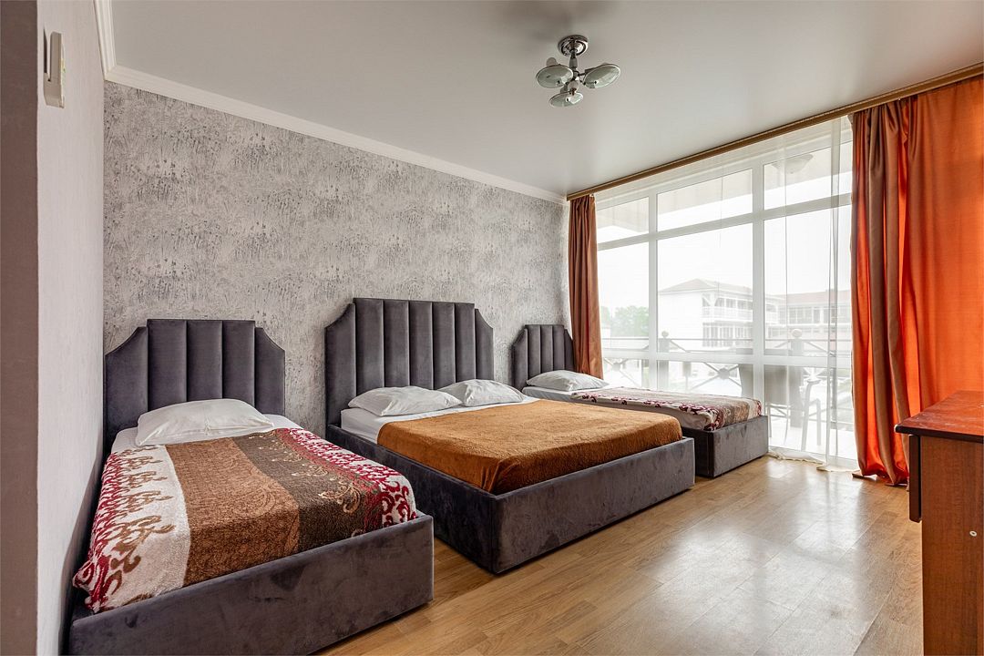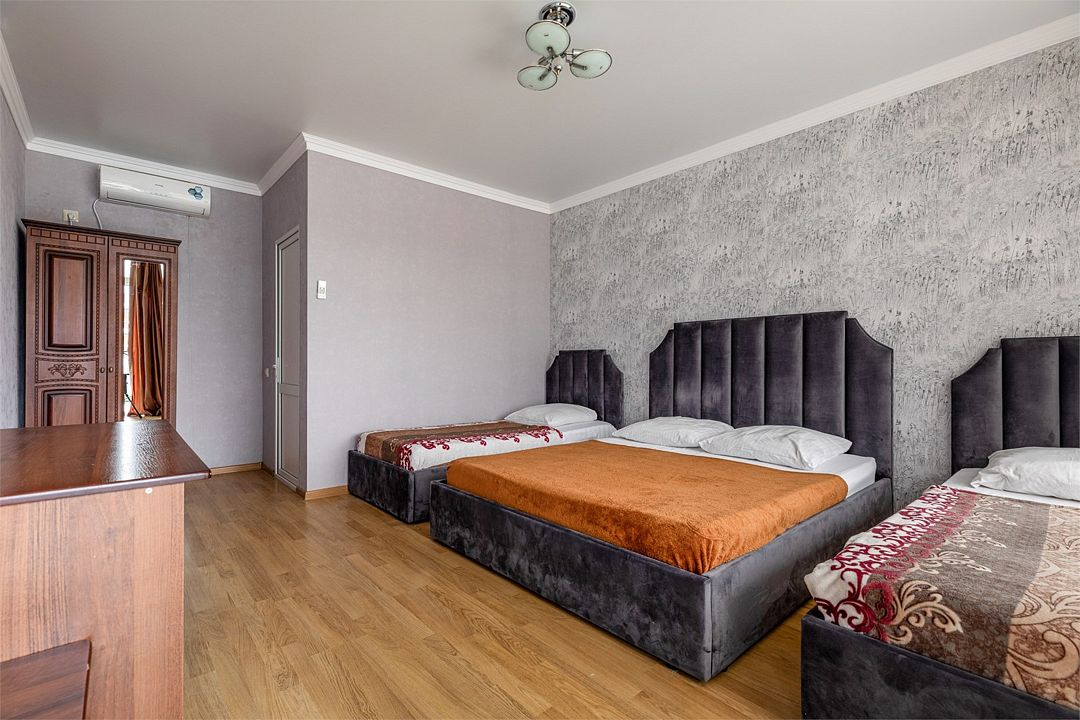 В номере двуспальная кровать и две односпальные кровати, шкаф, тумбочка, телевизор, кондиционер, стул, холодильник. Санузел с душем.Услуги и удобства