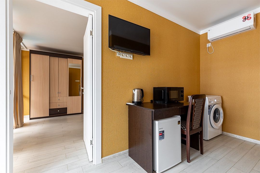 телевизор, Wi-Fi, интернет, холодильник, кондиционер, фен, микроволновая печь, душевая кабина, ванна или душевая кабина, санузел, банные полотенца, пляжные полотенца, гигиенические средства, косметические средства, двуспальная кровать, две односпальные кровати, шкаф для одежды, зеркало, пуфики, звуконепроницаемые стены и окна, обслуживание номеров, стиральная машина, чайник, унитаз, раковина, косметическое зеркало, питьевая вода, душ, вид во двор, ламинат, стаканы, туалетный столик, стул, стол, тумба, туалетный столик, туалетные средства, туалет, сушилка для белья, мини-холодильник, гостиничная парфюмерия, телевизор со Smart TV, номер для некурящих, вид на бассейн, экологичный подход, уборка номера, вешалки-плечики, мыло, затемняющая штора, международная розеткаВ гостиничном номере