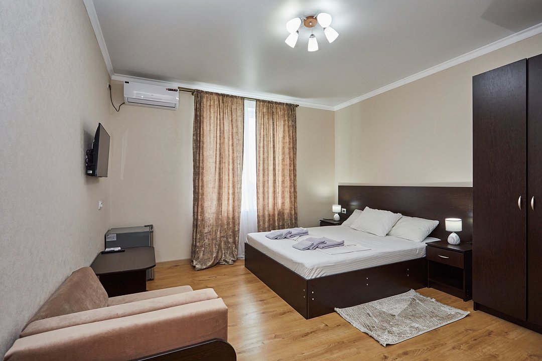 Номер оборудован двуспальной кроватью, раскладным креслом-кроватью, мини-холодильником, телевизором, а также набором полотенец для каждого гостя. В комнате есть шкаф для одежды, светильники и кондиционер. Ванная комната оснащена душем, унитазом, феном и туалетной бумагой.