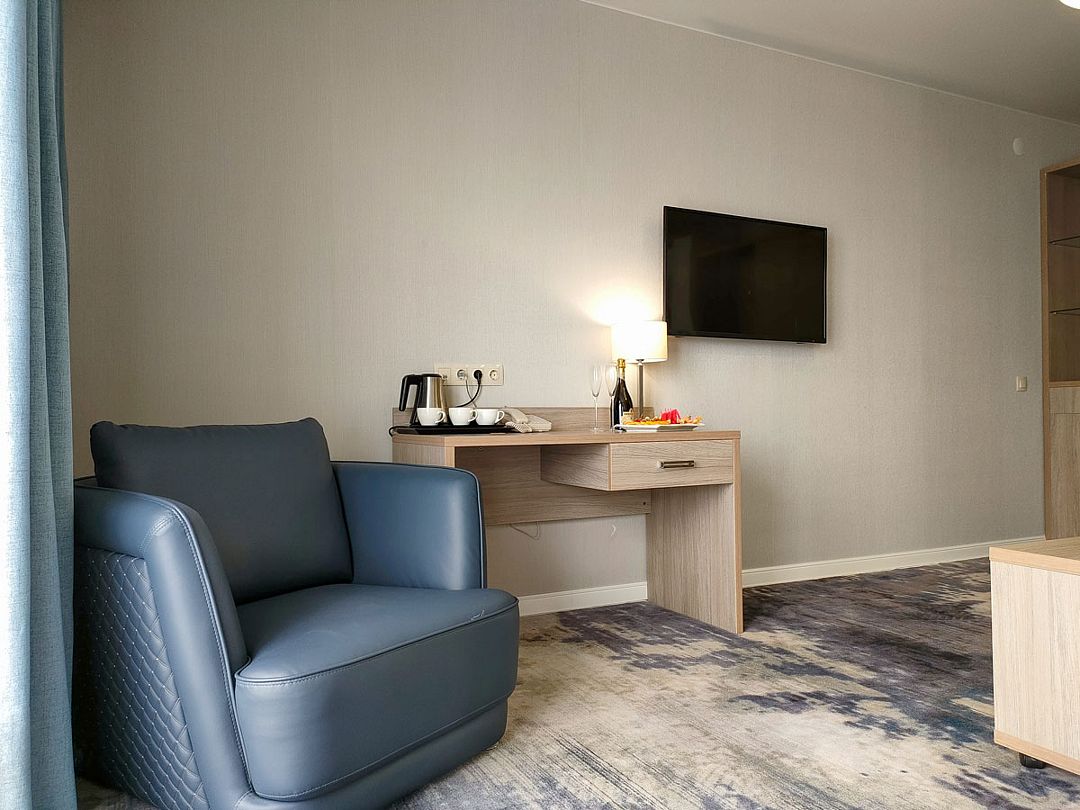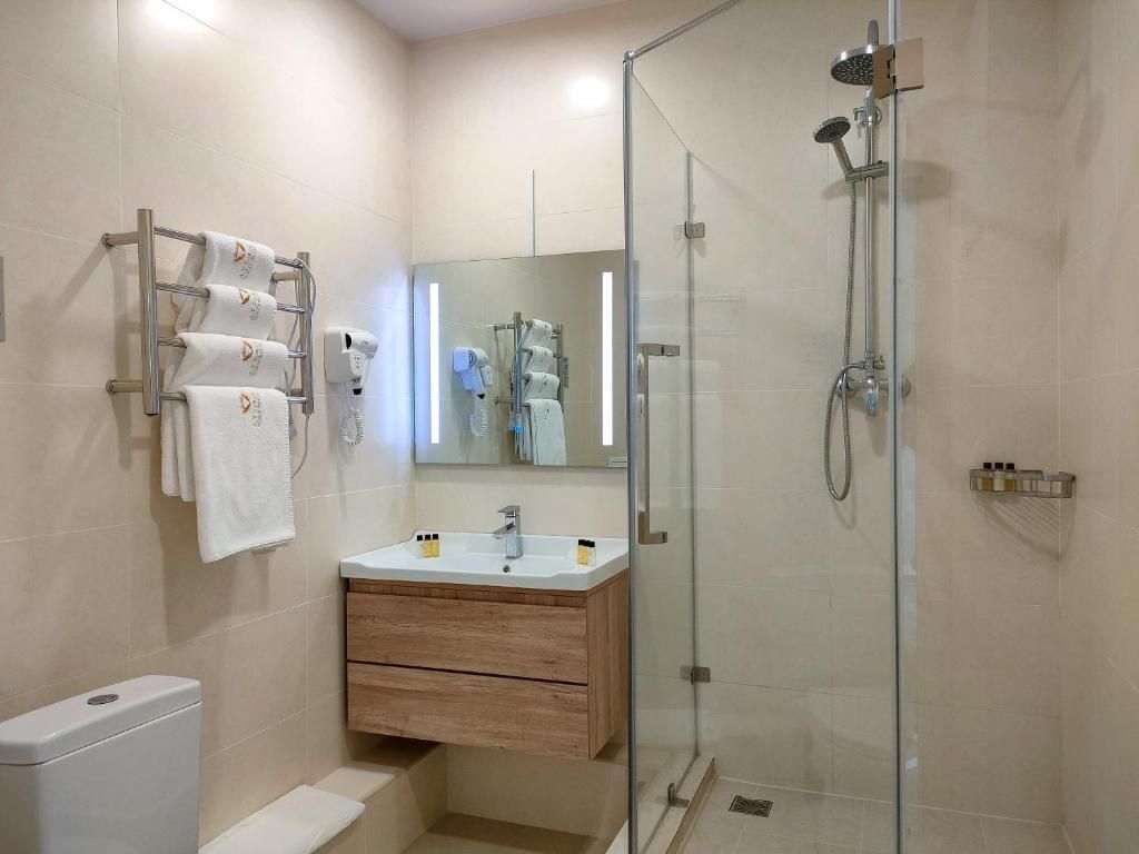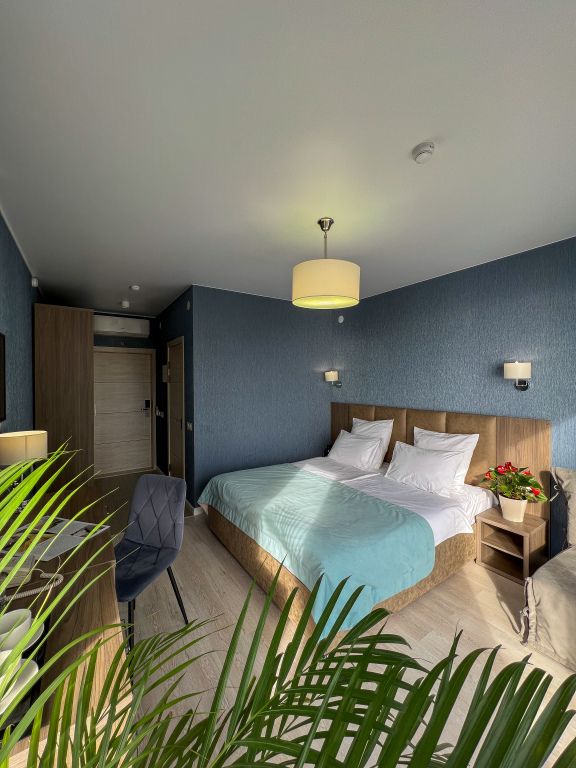 Номер стильный, современный. Стандарт, две кровати раздельных. Уборка отличная. В номере есть все необходимое, есть напольная сушилка, сейф, холодильник, чайник, халаты, тапочки, все принадлежности для душа так же есть, все супер!!