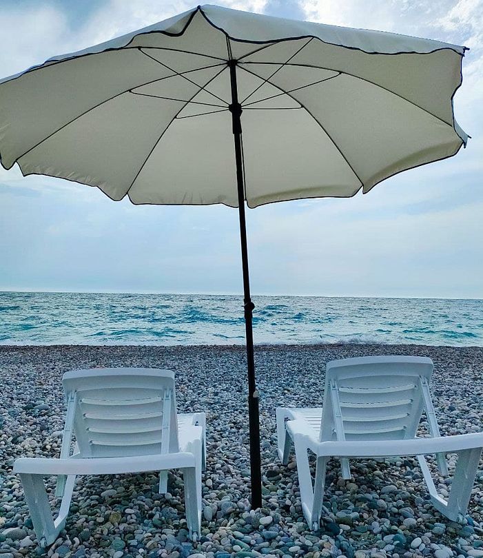 1 линия, до моря 5 минут, пляж галечный, зонтики и лежаки бесплатно.