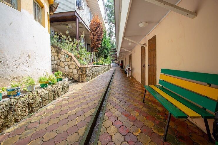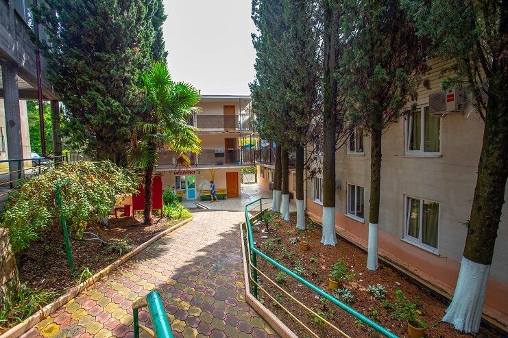 Территория пансионата площадью 1,5 Га с множеством деревьев, экзотических растений и цветов располагает к безмятежному отдыху. Воздух здесь целебный – горно-морской с примесью полезных для здоровья фитоциндов. На территории много удобных переходов и лестниц между разными уровнями, уютных мест для отдыха.