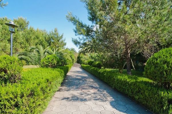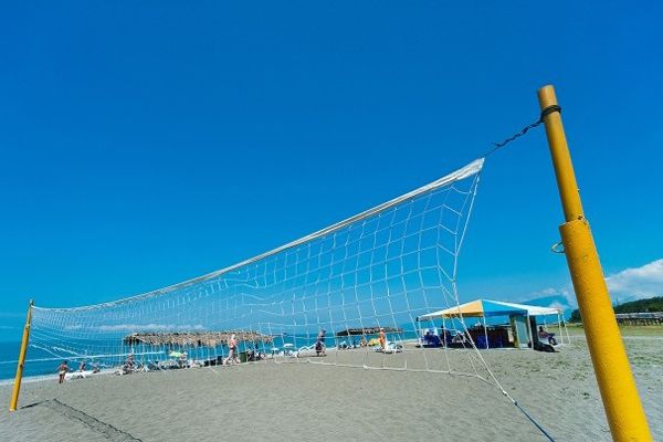 Дорога на пляж пансионата с широкой полосой сплошного песка занимает несколько минут. На берегу есть кабинки для переодевания, навесы, зонты и лежаки. Вода в море теплая, чистая и прозрачная.